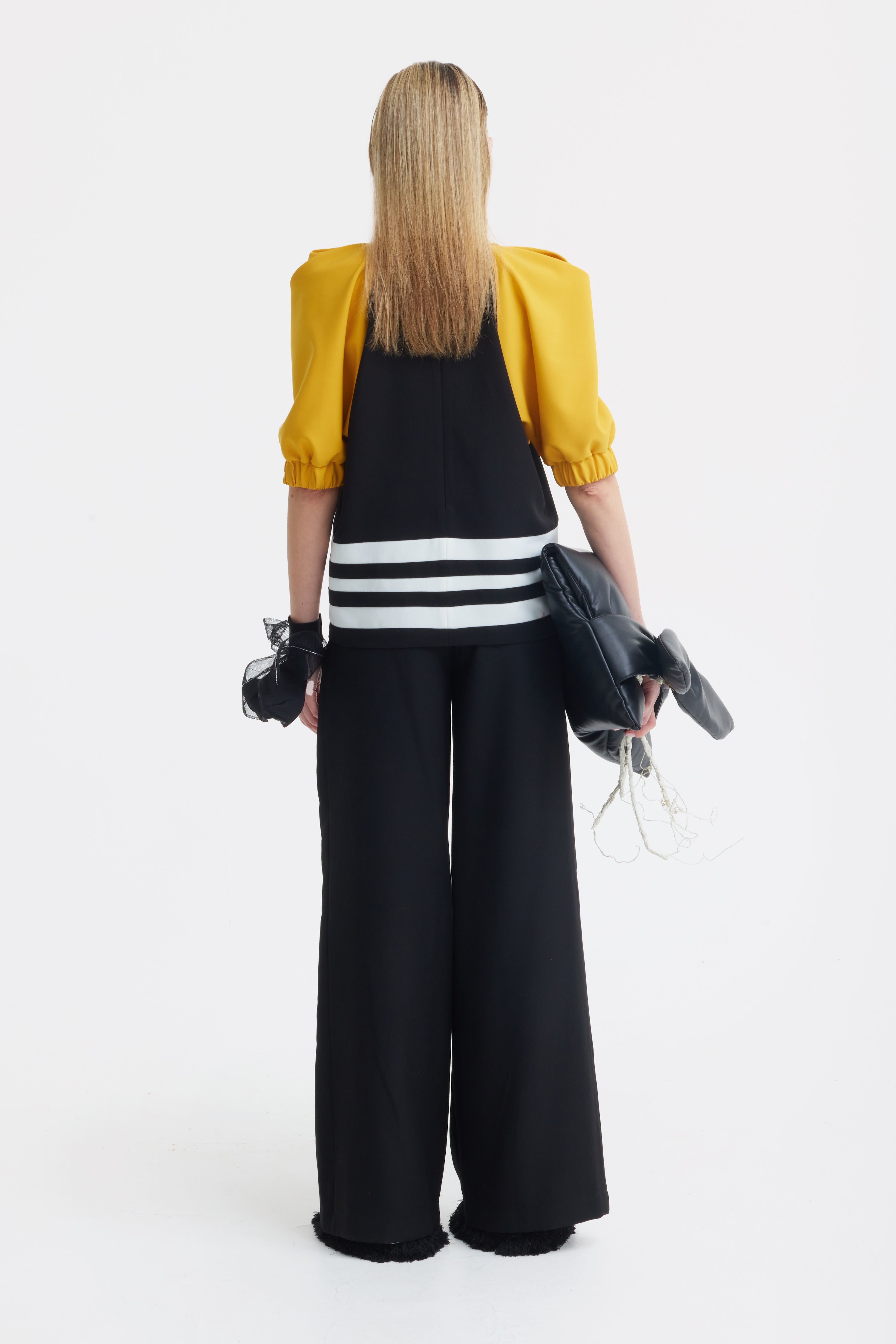 Bold contrast, soft volume. This black blouse with mustard accents combines retro elegance and modern minimalism. Designed with sculptural puff sleeves, a sharp statement collar, and striped detailing along the hem, it brings subtle drama to everyday dressing. Made from a medium-density viscose blend, it offers structure with movement, while the cotton-like sleeves provide a soft tactile balance. The hidden back zipper ensures a clean fit like a contemporary staple with timeless character.