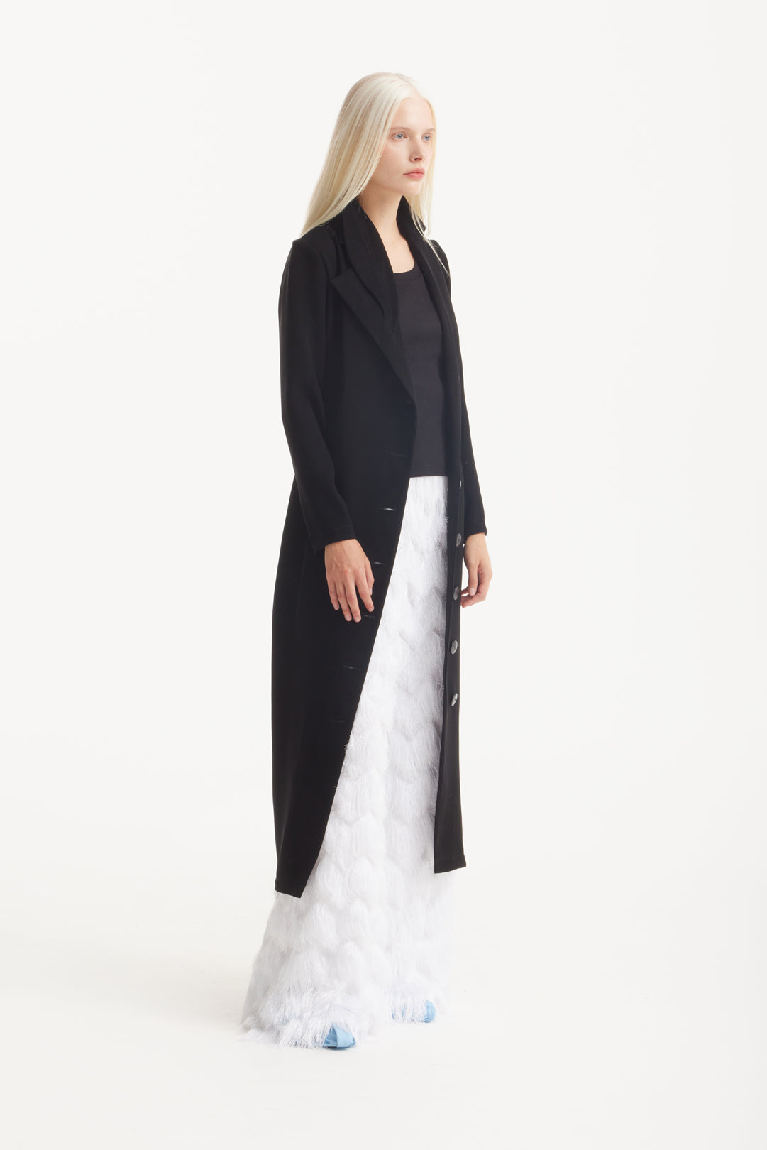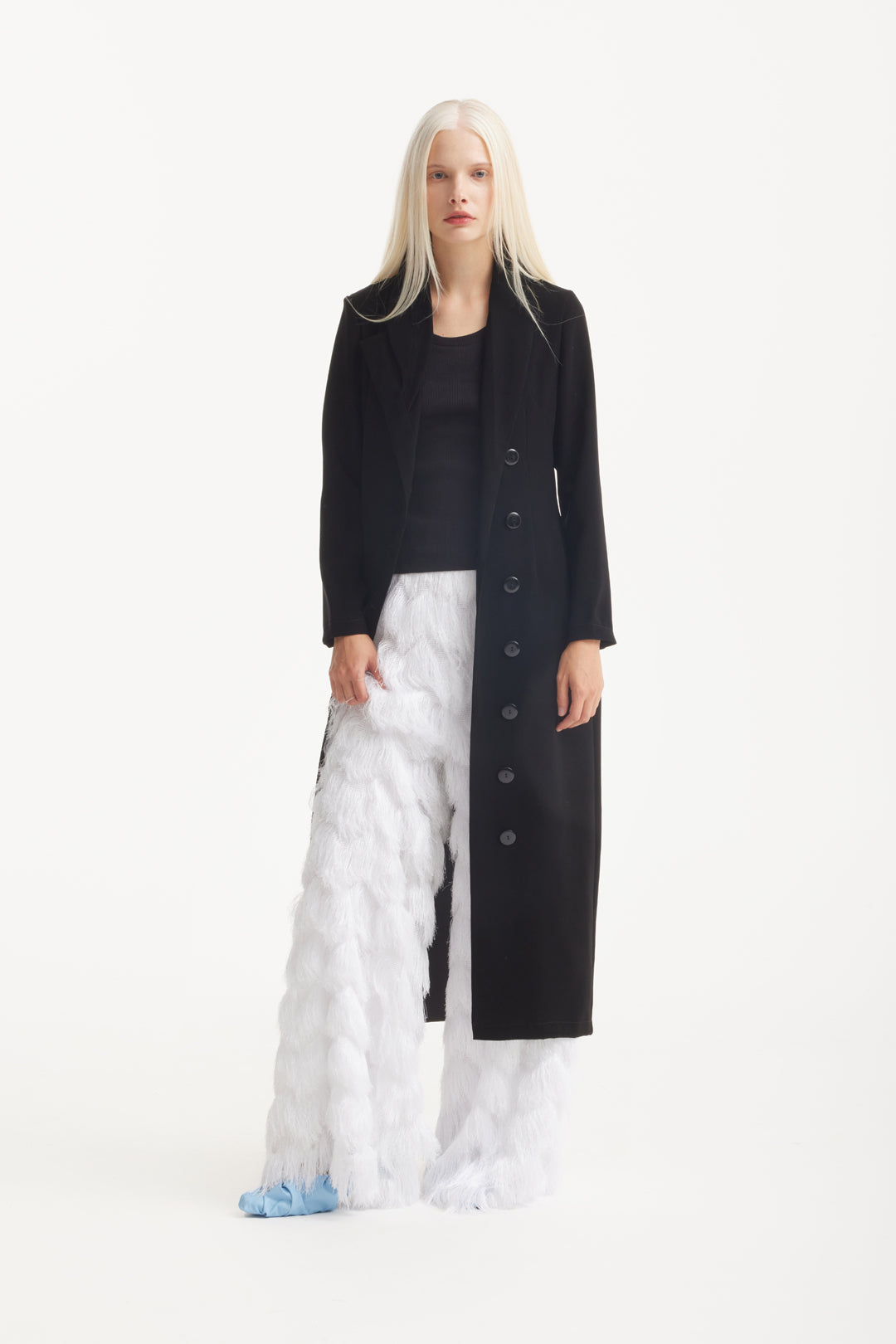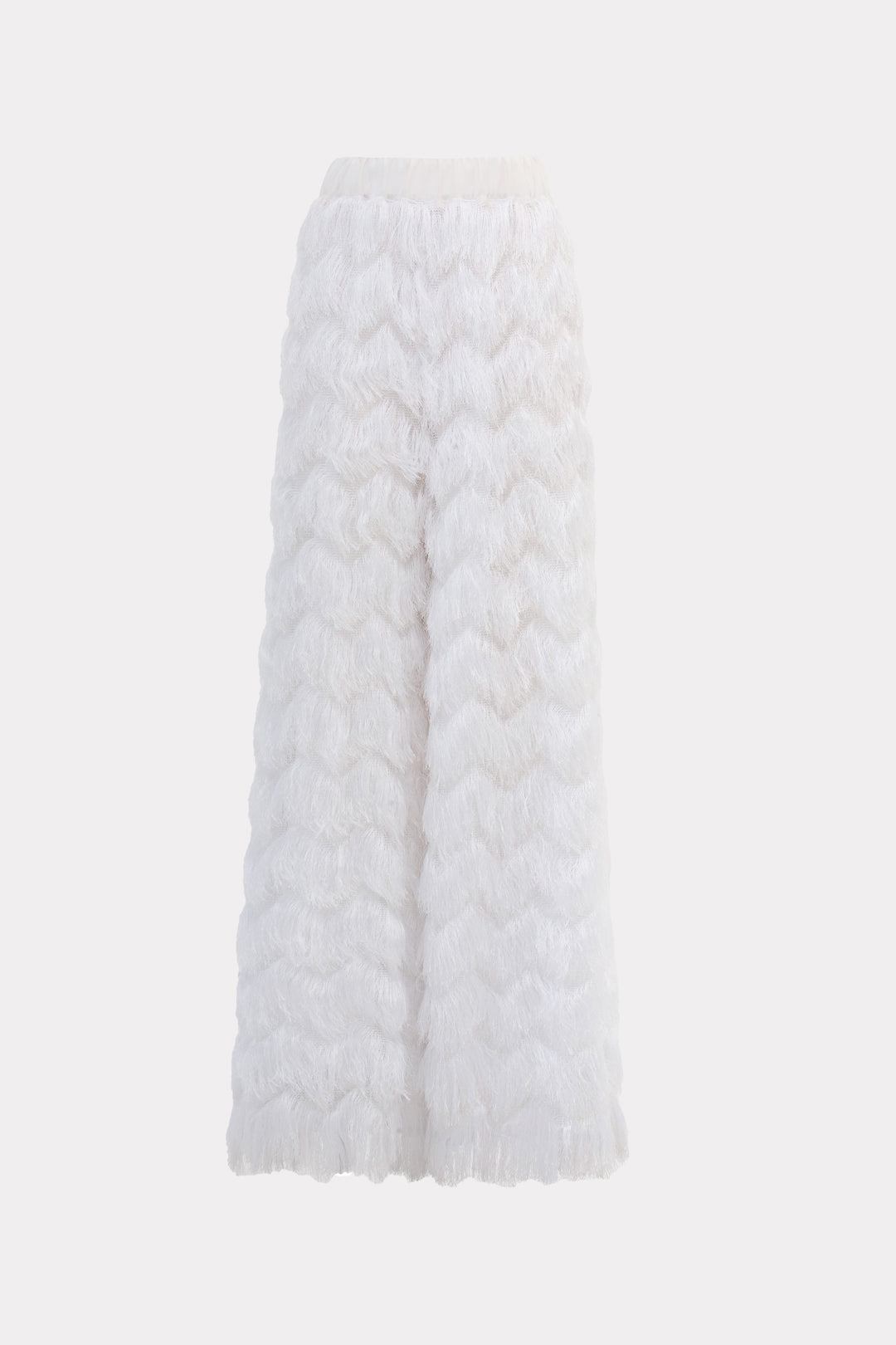 A modern interpretation of elegance in motion. These white palazzo pants are defined by cascading layers of textured fringe that move with sculptural fluidity. Designed with a wide-leg silhouette and soft internal lining, they offer both comfort and refined structure. The elastic waistband ensures effortless wear, while the bold texture makes each step a statement. Handcrafted in Europe, these pants merge ease with avant-garde design, perfect for evening occasions, curated wardrobes, or standout street style.