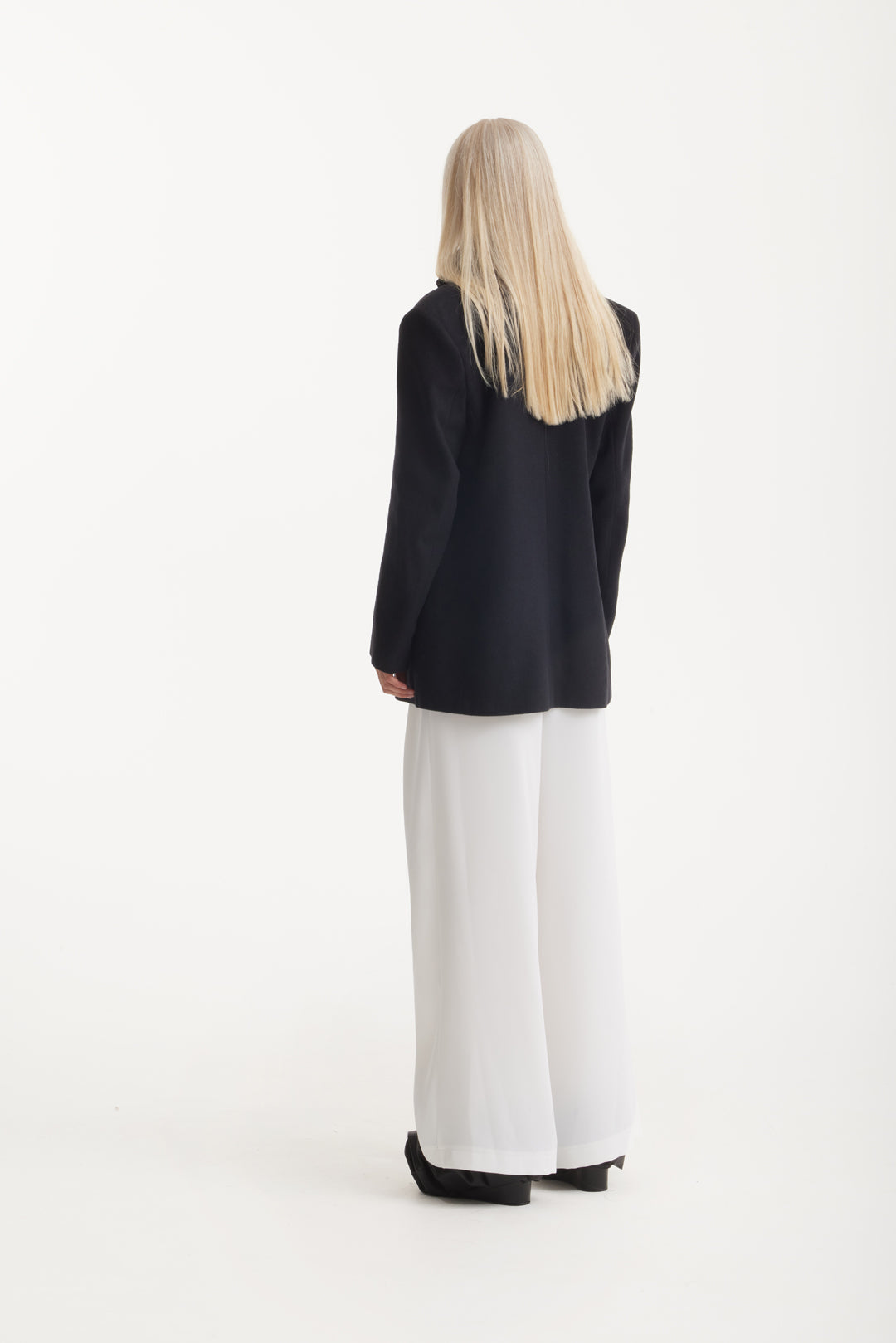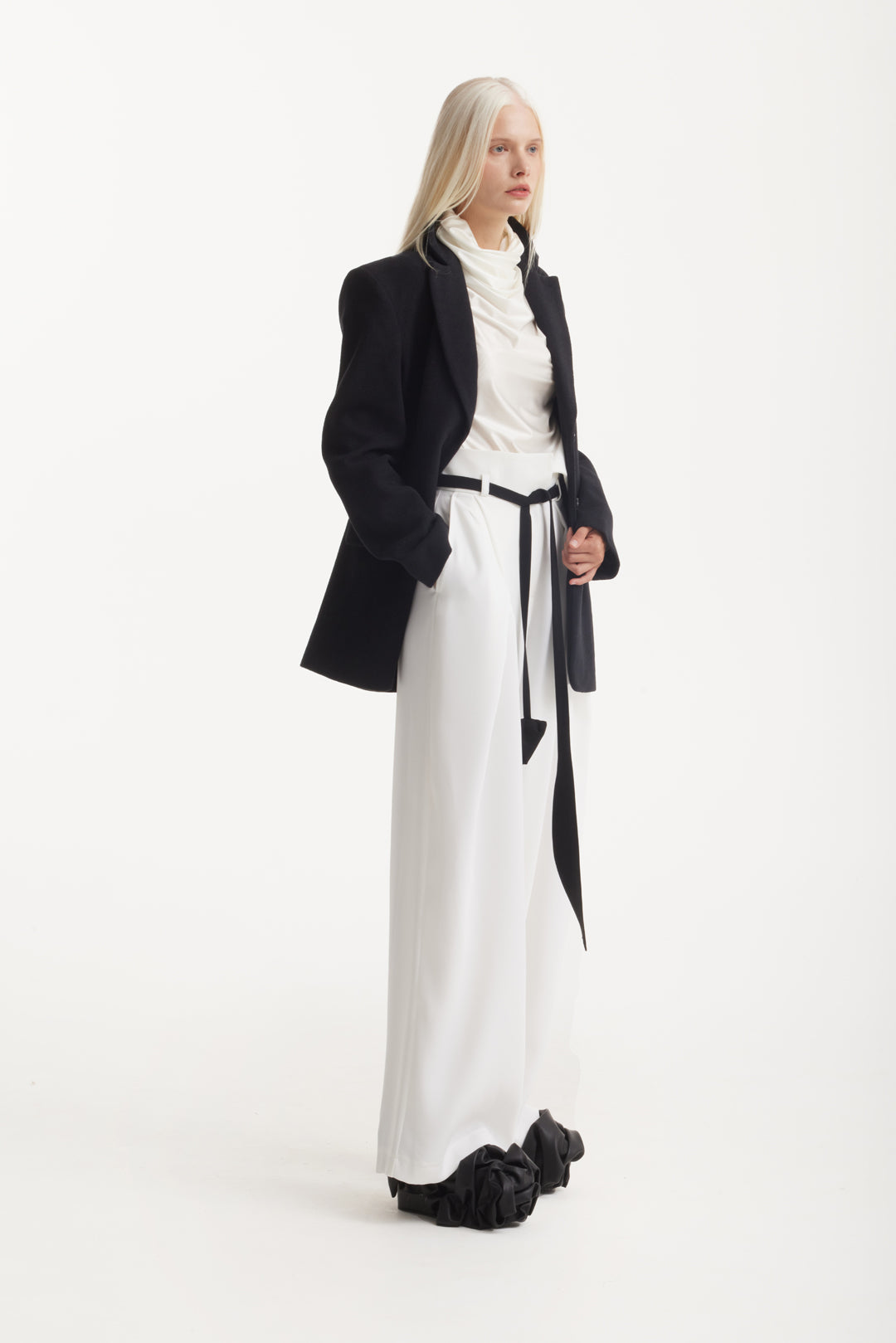 Sculptural yet fluid. These wide-leg ivory trousers feature architectural side folds and a crisp silhouette that elongates the form. Designed with an asymmetric waistband and a black contrast belt finished with a sculptural leaf tip, they offer a refined take on bold dressing. Cut from structured suiting fabric and ethically made in Europe, these trousers blend function, comfort, and artistic detail for statement looks with minimal effort.