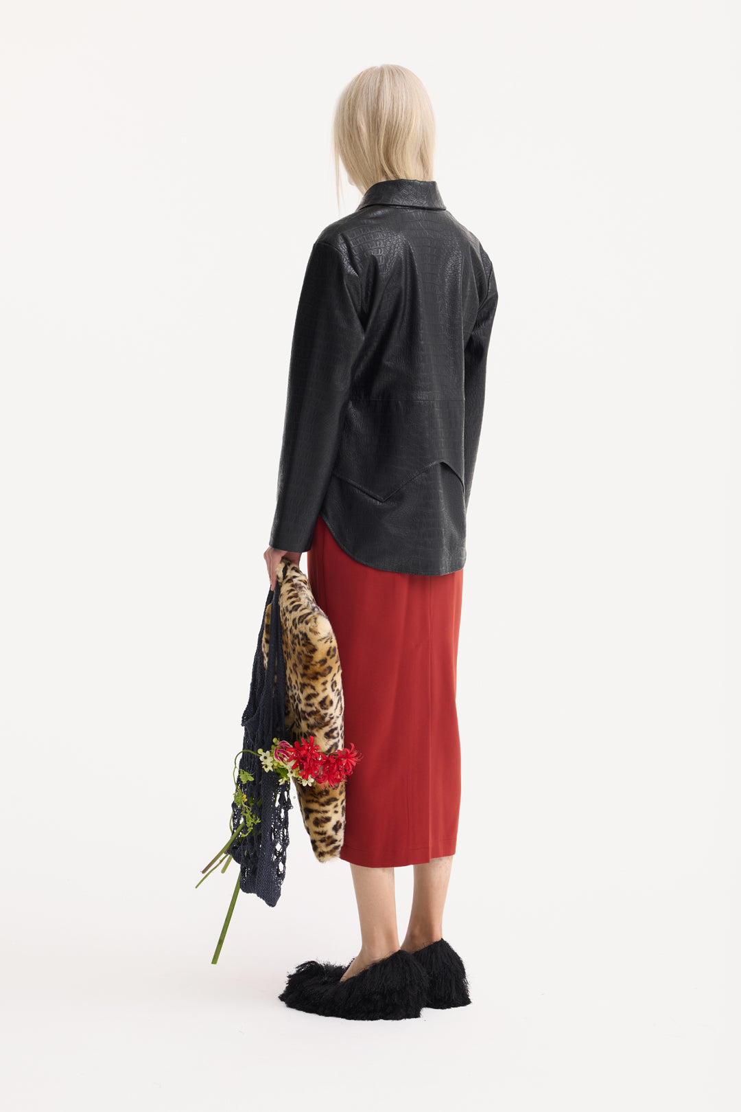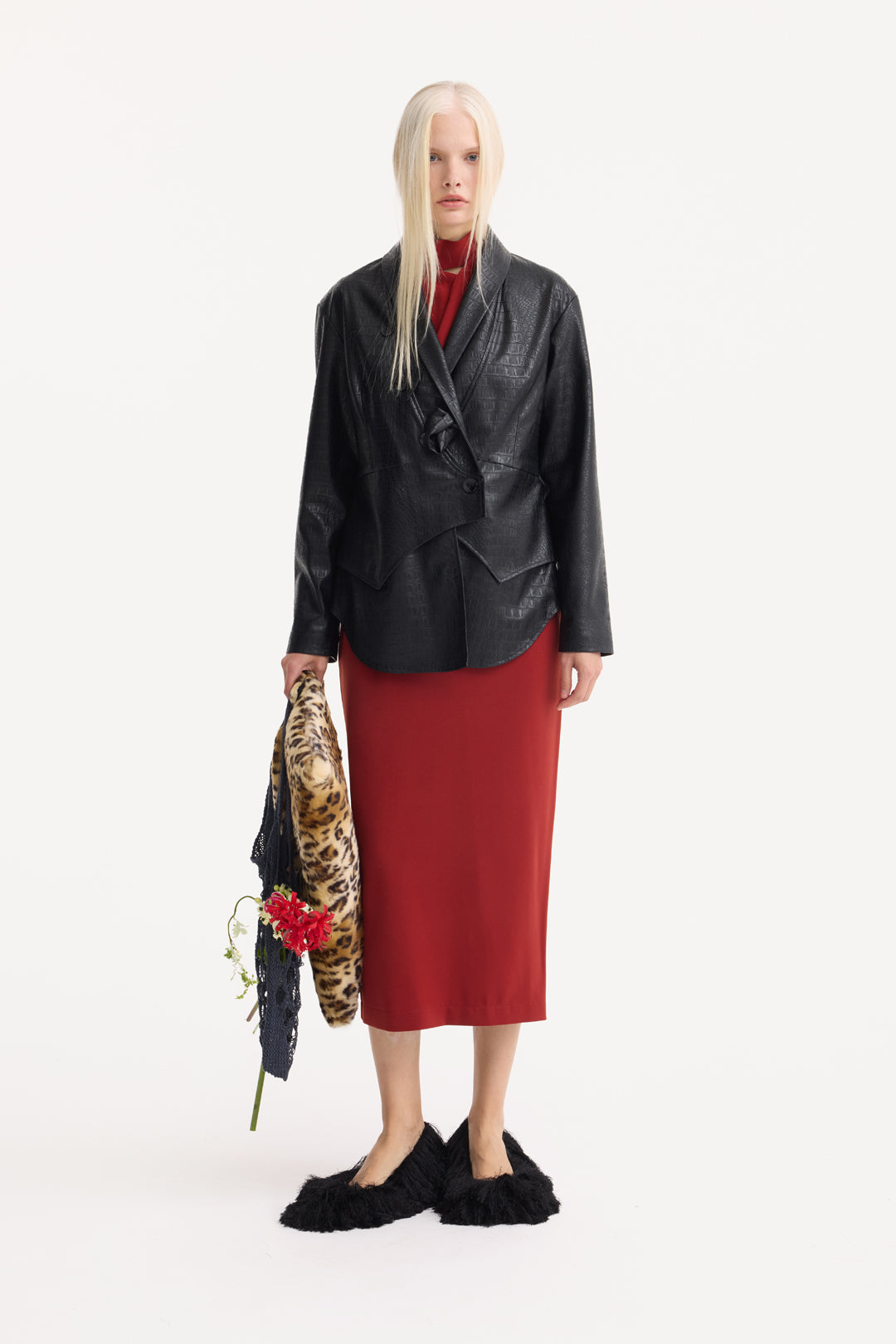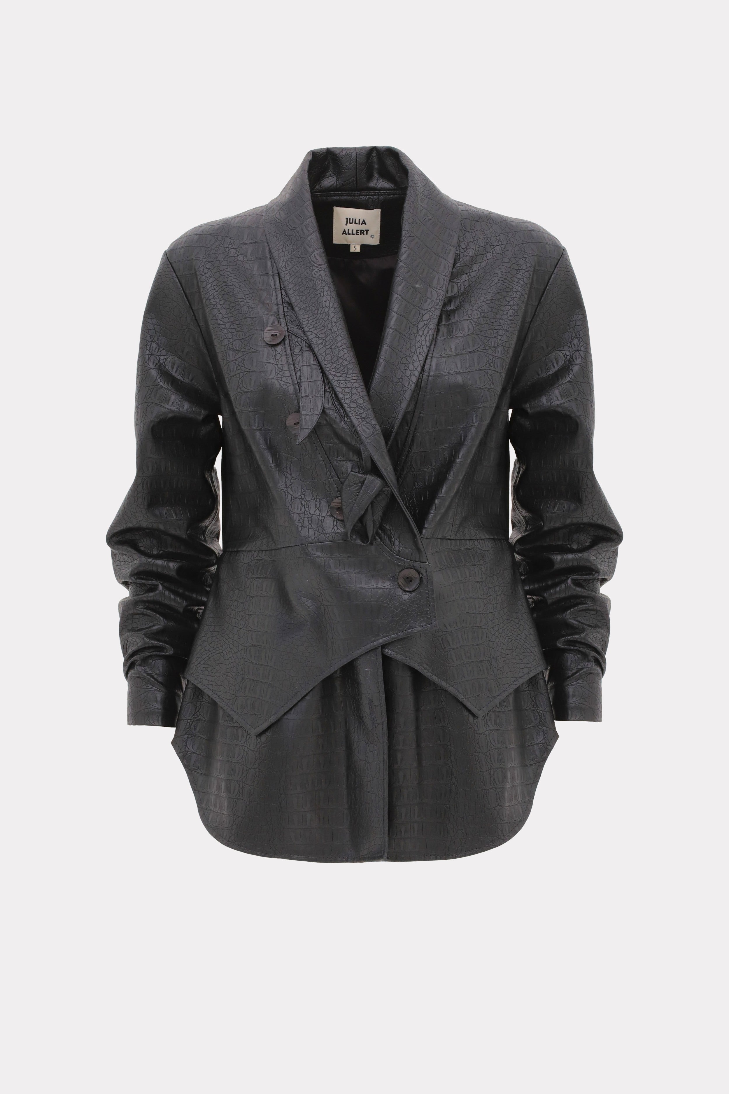 This tailored blazer redefines texture and precision. Crafted from premium faux leather with an embossed crocodile pattern, it combines structure with soft movement. The asymmetric front, sculptural lapels, and artisanal detailing highlight Julia Allert’s mastery of modern tailoring. A statement piece for day or evening, it channels confidence and individuality through form and finish. Ethically made in Europe for those who value bold sophistication.