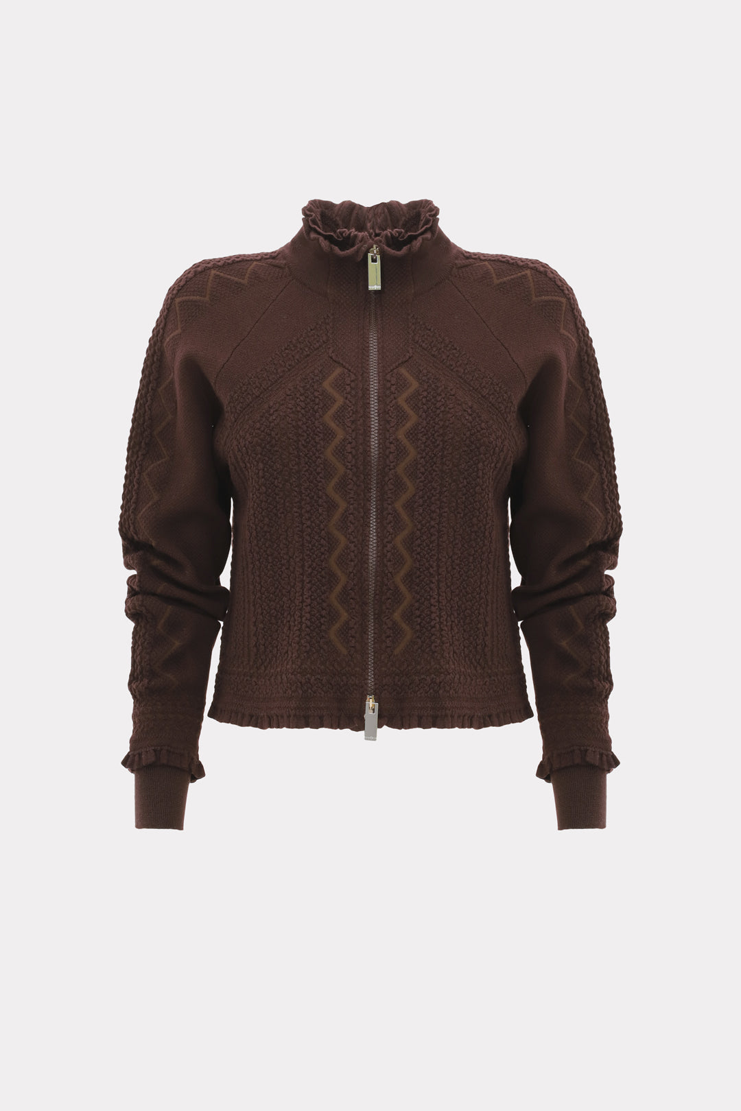 A sculptural take on a classic silhouette. This dark brown zip cardigan is crafted from a premium wool blend for structure, warmth, and movement. The intricate zigzag knit texture adds depth, while subtle ruffle trims at the neck and cuffs lend a soft feminine contrast. Designed for a close-yet-comfortable fit, it’s the perfect layer for transitional weather or as a statement indoor piece. Pair with tailored trousers or flowing skirts for a modern textural look.