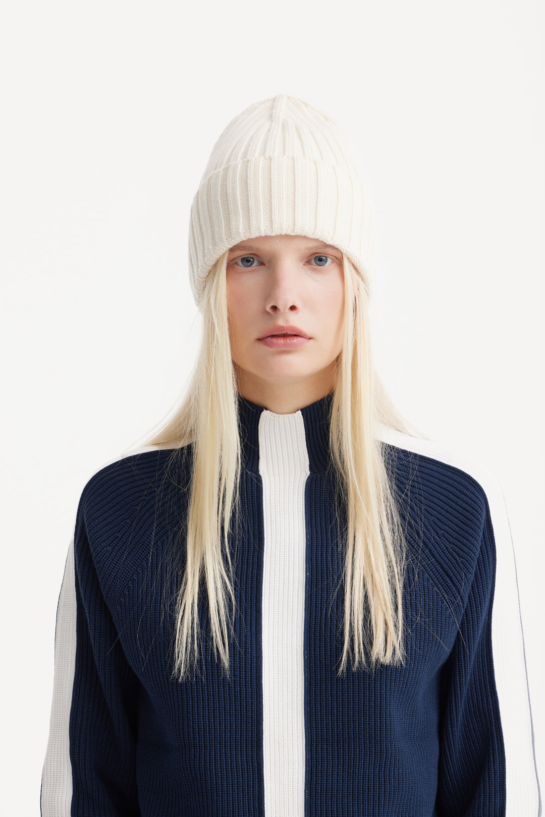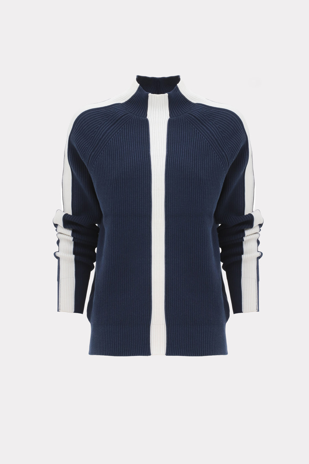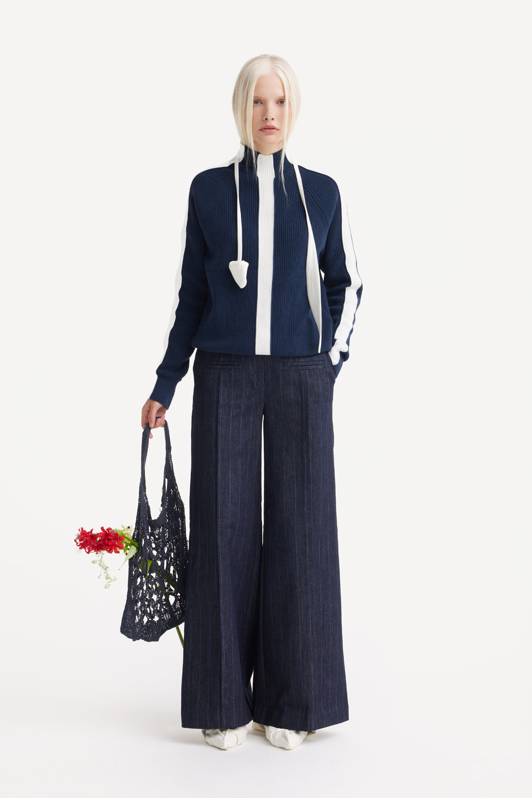 A study in structure and contrast. This navy and white ribbed sweater is crafted from a soft wool blend, featuring architectural lines and a high collar for a refined silhouette. The two-tone design creates a sculptural effect, blending comfort with modern edge. Ethically made in Europe, it’s a statement knit for minimalist wardrobes.