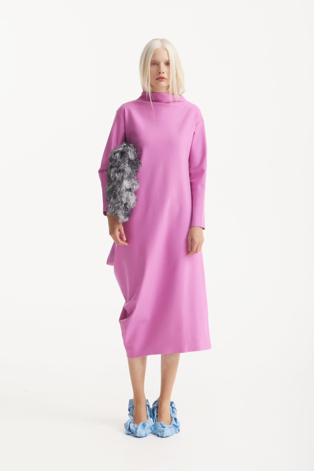 This fashionable dress is made of soft knitwear of medium density. The dress for women has a rather complex asymmetrical cut. The dress is not equipped with any fasteners, as the neckline is quite comfortable and stretches well. The right side of the dress is equipped with a pocket. In combination with pumps with heels, this will give you a unique look, and in combination with sneakers - a stylish everyday look.