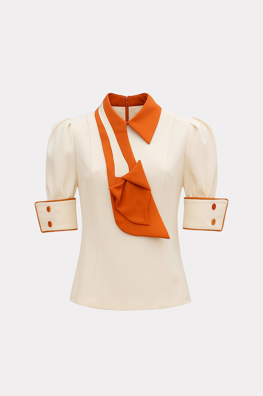 A statement in contrasts, this ivory and burnt orange blouse by Julia Allert blends sculptural form with effortless sophistication. Crafted from smooth, structured viscose-blend fabric, it features a fitted silhouette with softly gathered shoulders and wide cuffs accented by amber piping and buttons.