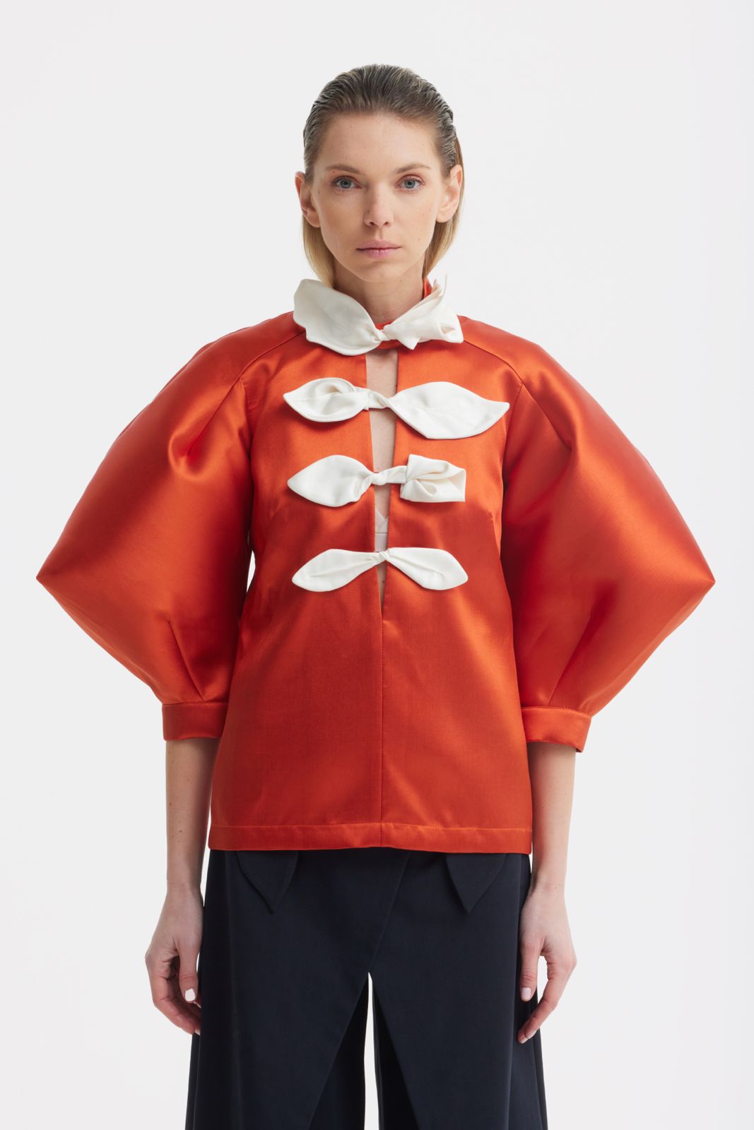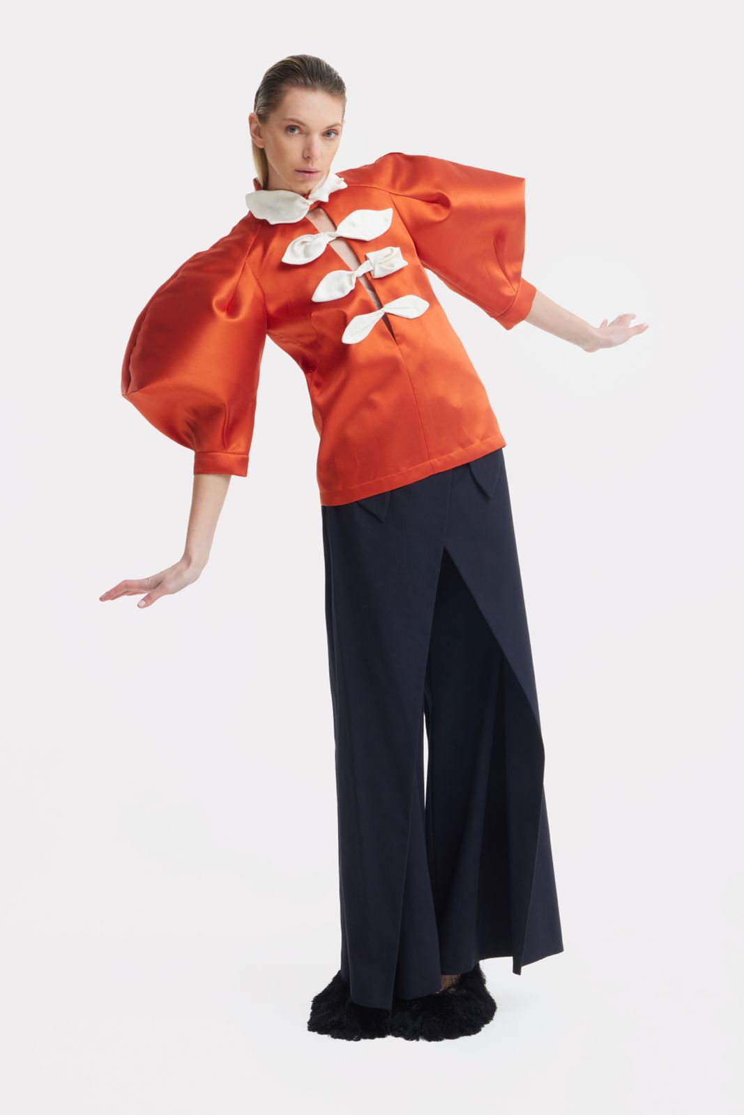 A modern sculpture in motion, this burnt orange taffeta blouse by Julia Allert captures the art of structured femininity. Crafted from premium satin-finish taffeta, it features a deep V-neckline and voluminous raglan sleeves that shape a bold, architectural silhouette.