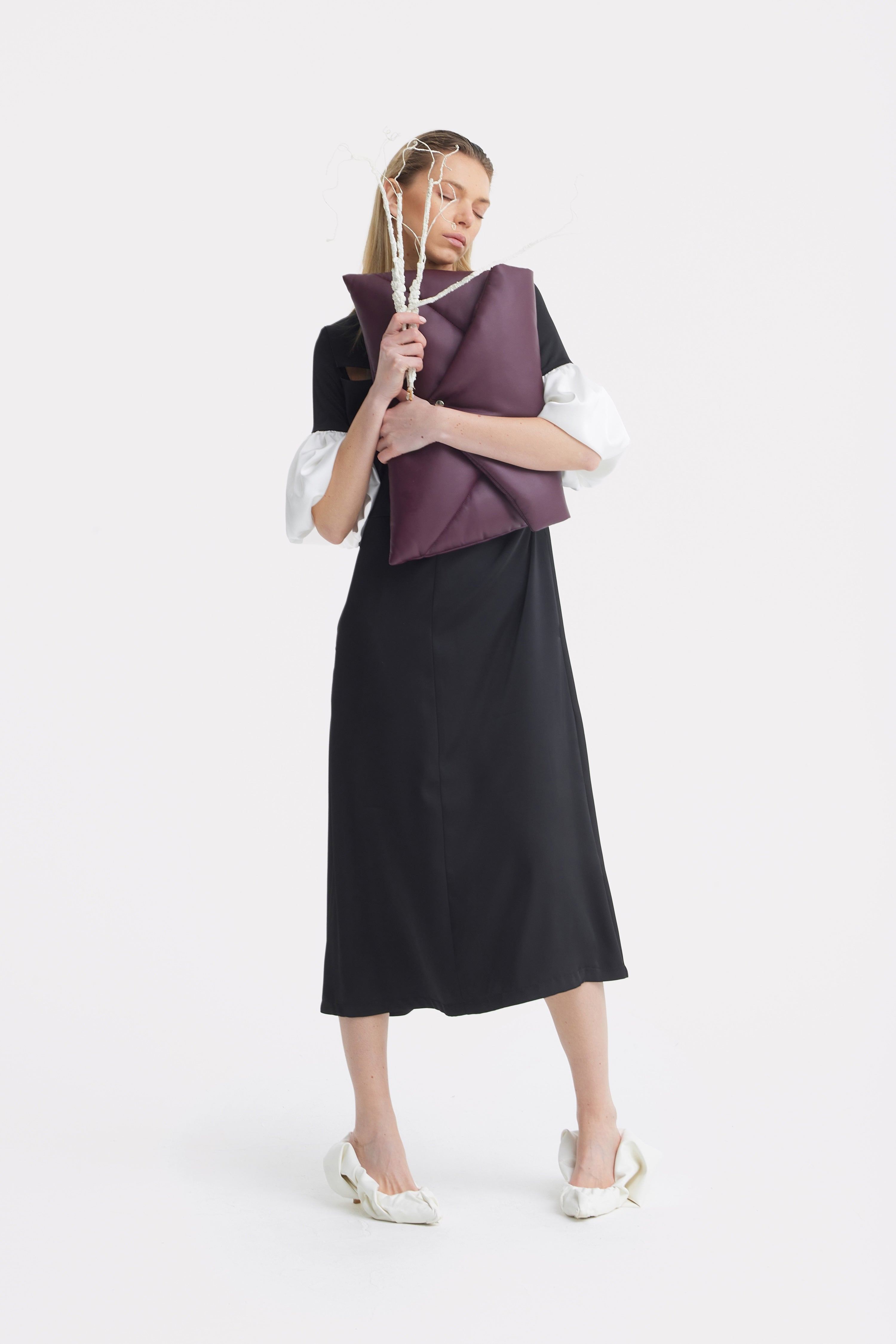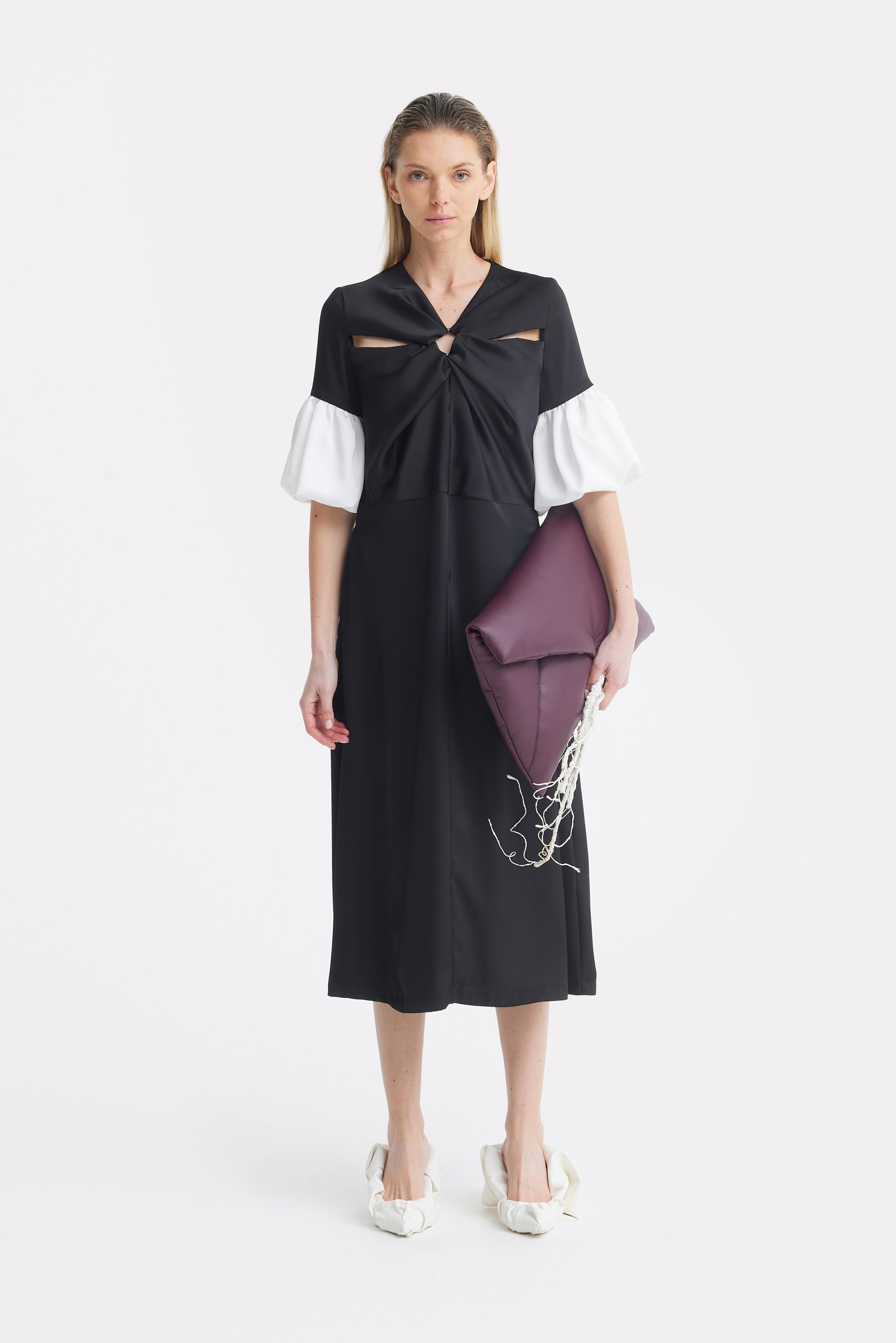This striking black midi dress blends architectural detailing with timeless elegance. Featuring a sculptural bow-like twist at the chest and voluminous white puff sleeves, it offers a bold, fashion-forward silhouette that’s both structured and feminine. Crafted from a premium viscose blend, the dress is soft yet holds its form beautifully, ensuring all-day comfort and clean lines. The A-line cut flatters the figure, while the contrast of monochrome tones adds graphic sophistication. Perfect for gallery openings, formal occasions, or editorial-inspired styling — this dress is a standout piece for those who value artistic design with wearability.