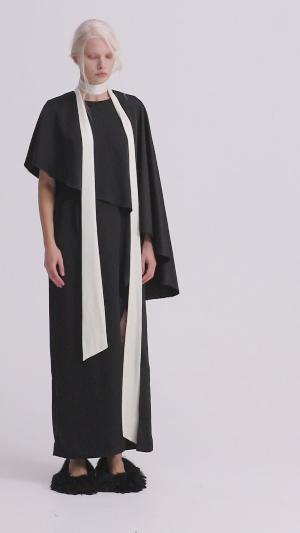 A front slit with a subtle wrap effect adds a touch of allure and ease of motion. The look is finished with a detachable contrast scarf that can be styled around the neck, draped over the shoulder, or worn loose for a personalized, editorial finish.