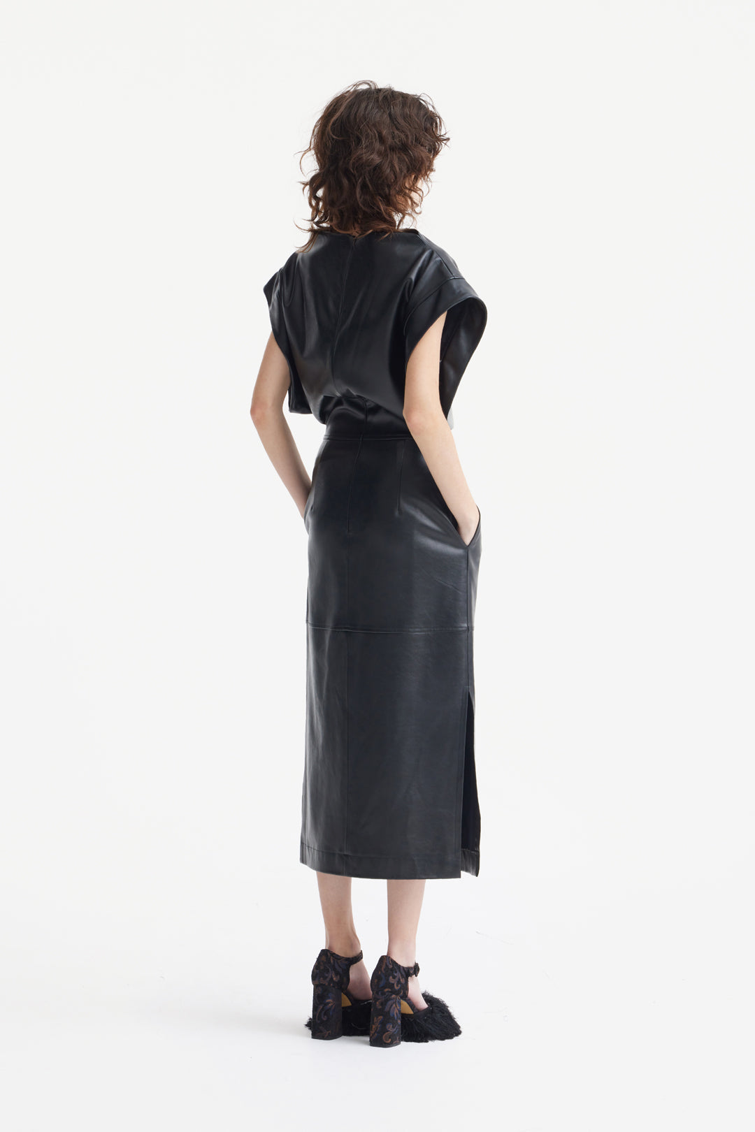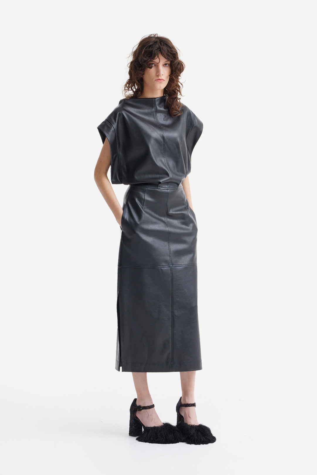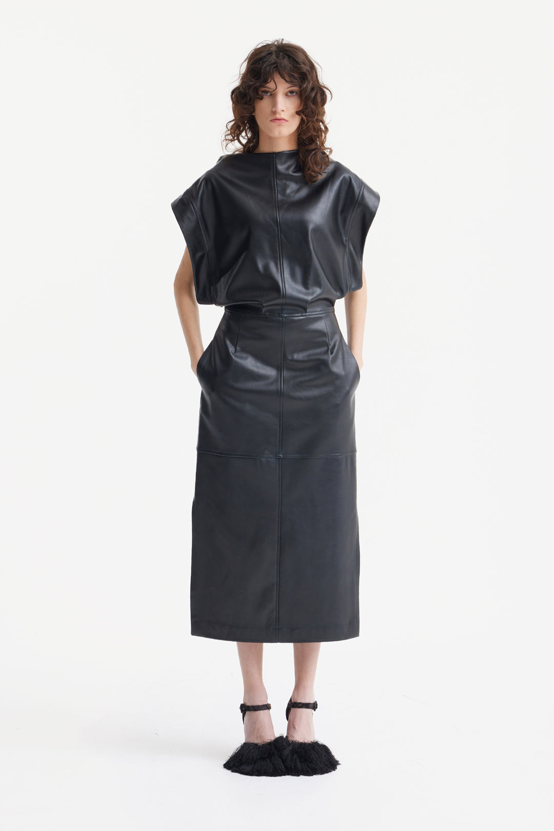Introduce a touch of bold sophistication to your wardrobe with our fitted dress, a stunning creation in black. This dress is beautifully crafted from high-quality faux leather with a suede interior, symbolizing both courage and elegance. It is designed to provide you with memorable experiences, enhanced by its unique style.