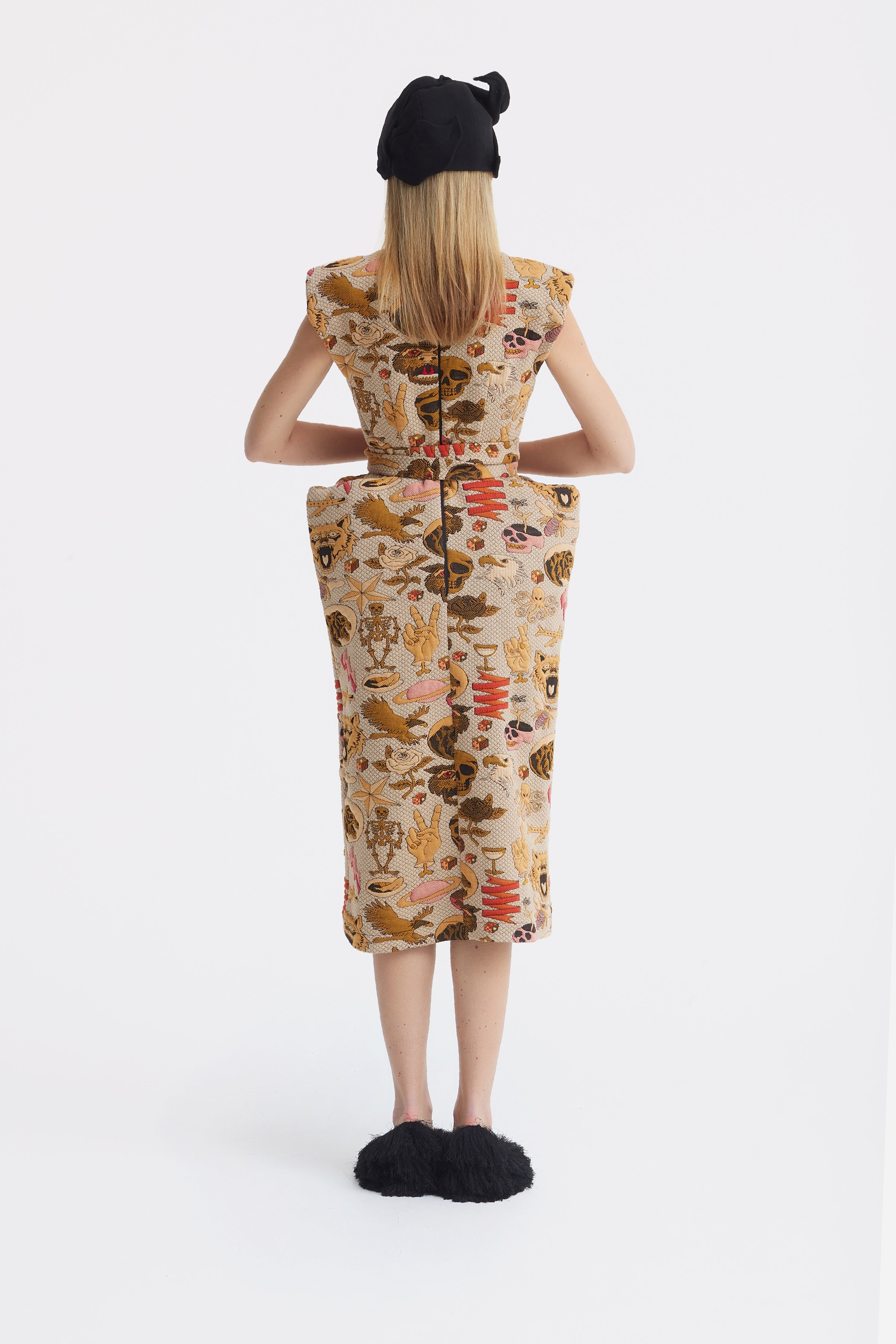 Unleash your bold side with this Fashion Midi Dress With Belt and Bold Shoulders, crafted from luxurious jacquard fabric. Featuring a striking tattoo-inspired pattern with fierce lion motifs, skulls, and lightning bolts, this dress redefines power dressing with a rebellious yet artistic edge.