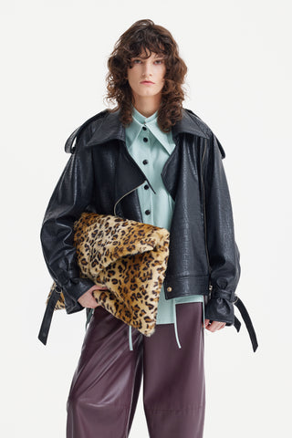 Taffeta Deep V-Neck Blouse With Satin Floral Detail – Black