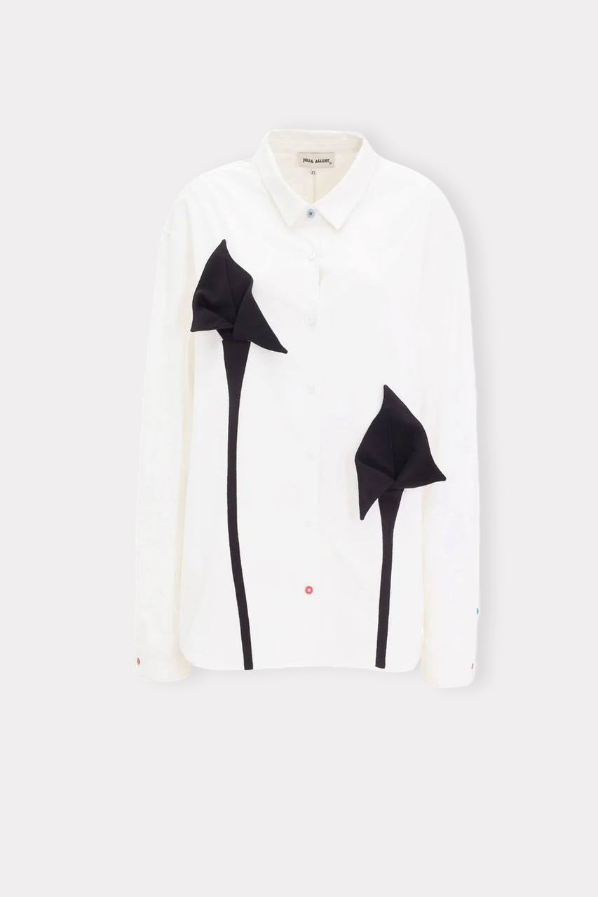 The versatile, loose style of the shirt offers you the flexibility to wear it as a standalone piece for an effortlessly elegant look, or layered over a turtleneck or T-shirt for a more dynamic and contemporary ensemble. Whether you're aiming for a sophisticated office look or a relaxed weekend vibe, this Long Sleeve Button-Up Shirt with Handmade Details in White is the perfect blend of style, comfort, and uniqueness.