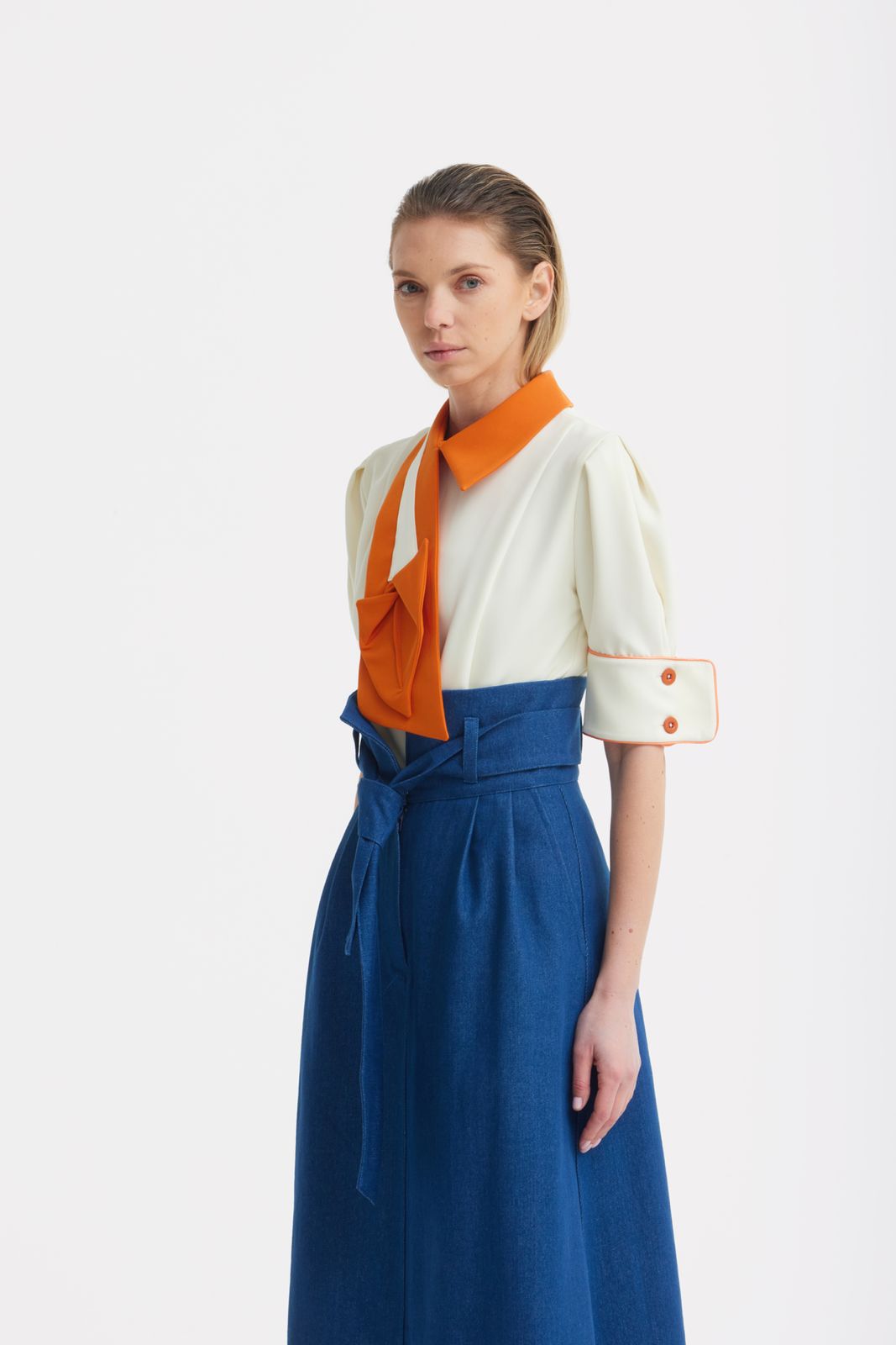 The sharp tailored collar transitions into an asymmetrical draped scarf in deep burnt orange, creating a striking interplay of geometry and motion. The result is a piece that feels both timeless and modern, elegant enough for formal settings, expressive enough for creative moments. A true Julia Allert signature, this blouse transforms everyday dressing into an act of artful intention.