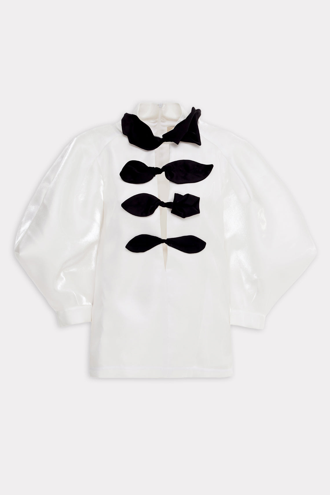 Along the deep V-neckline, four hand-formed black satin floral accents, designed as stylized leaves, serve as both fastening and ornamentation, transforming the blouse into a wearable piece of modern couture. The contrasting details emphasize shape, movement, and intention, adding depth to the crisp white base.