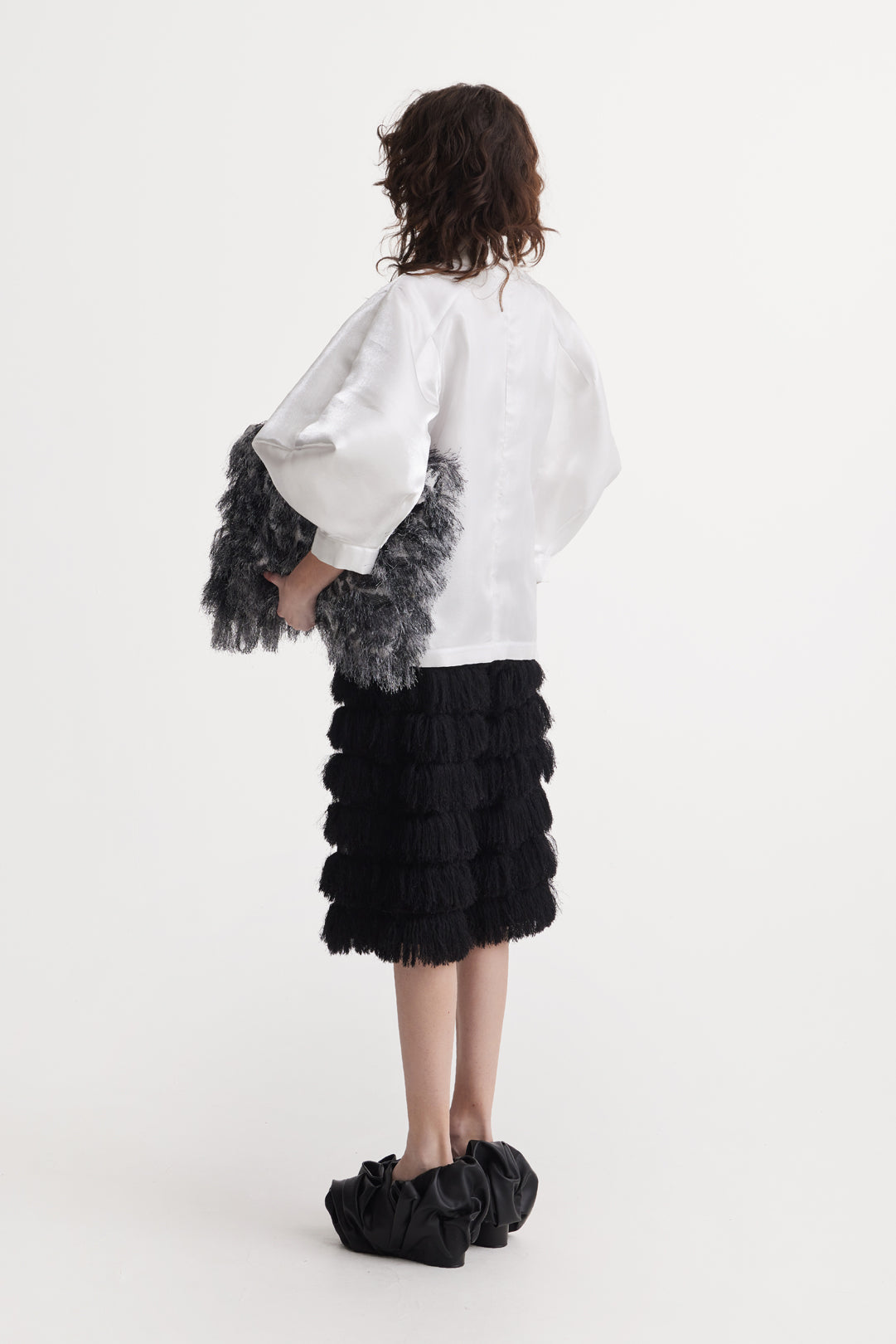 A sculptural white blouse that embodies Julia Allert’s signature balance of purity and bold expression. Crafted from structured taffeta with a subtle satin sheen, this piece features a clean straight silhouette and dramatic voluminous sleeves that create a soft architectural presence.