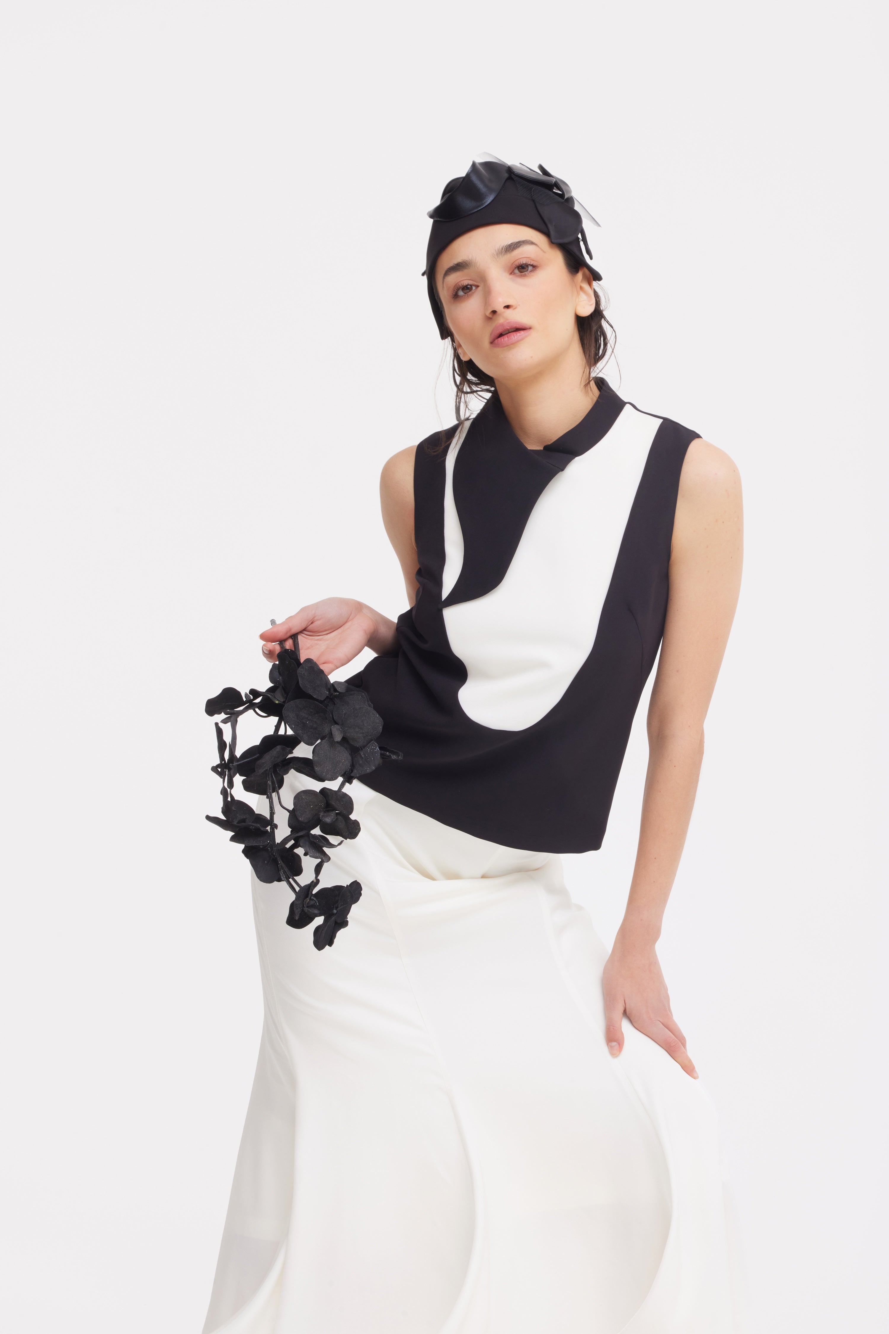 This asymmetrical sleeveless top features a striking black and white contrast with a modern cut-out design. The unique collar drapes elegantly, adding a sculptural element to the minimalist silhouette. Perfect for a sleek, contemporary look, it pairs beautifully with high-waisted trousers or skirts. Crafted from medium-density fabric, this top offers both comfort and bold, modern elegance, making it an essential piece for any fashion-forward wardrobe. Ideal for both formal and casual occasions.