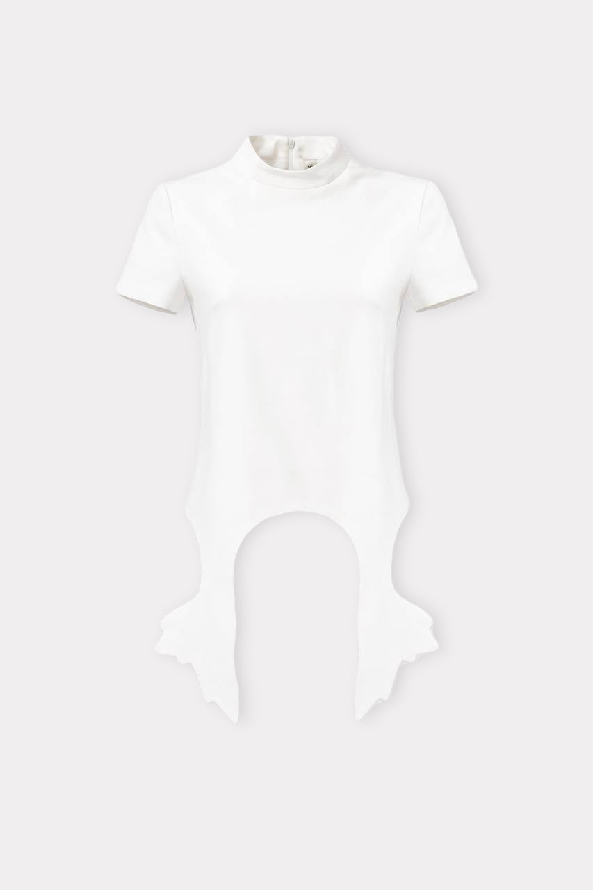 The standout feature—a sculpted hemline with artistic cut-out detailing—adds dimension and movement without clinging to the body. A discreet back zipper ensures easy wear and a seamless finish. Perfect for styling with tailored trousers, skirts, or high-rise denim, this fashion-forward blouse is ideal for contemporary office looks, gallery visits, or chic city outings.