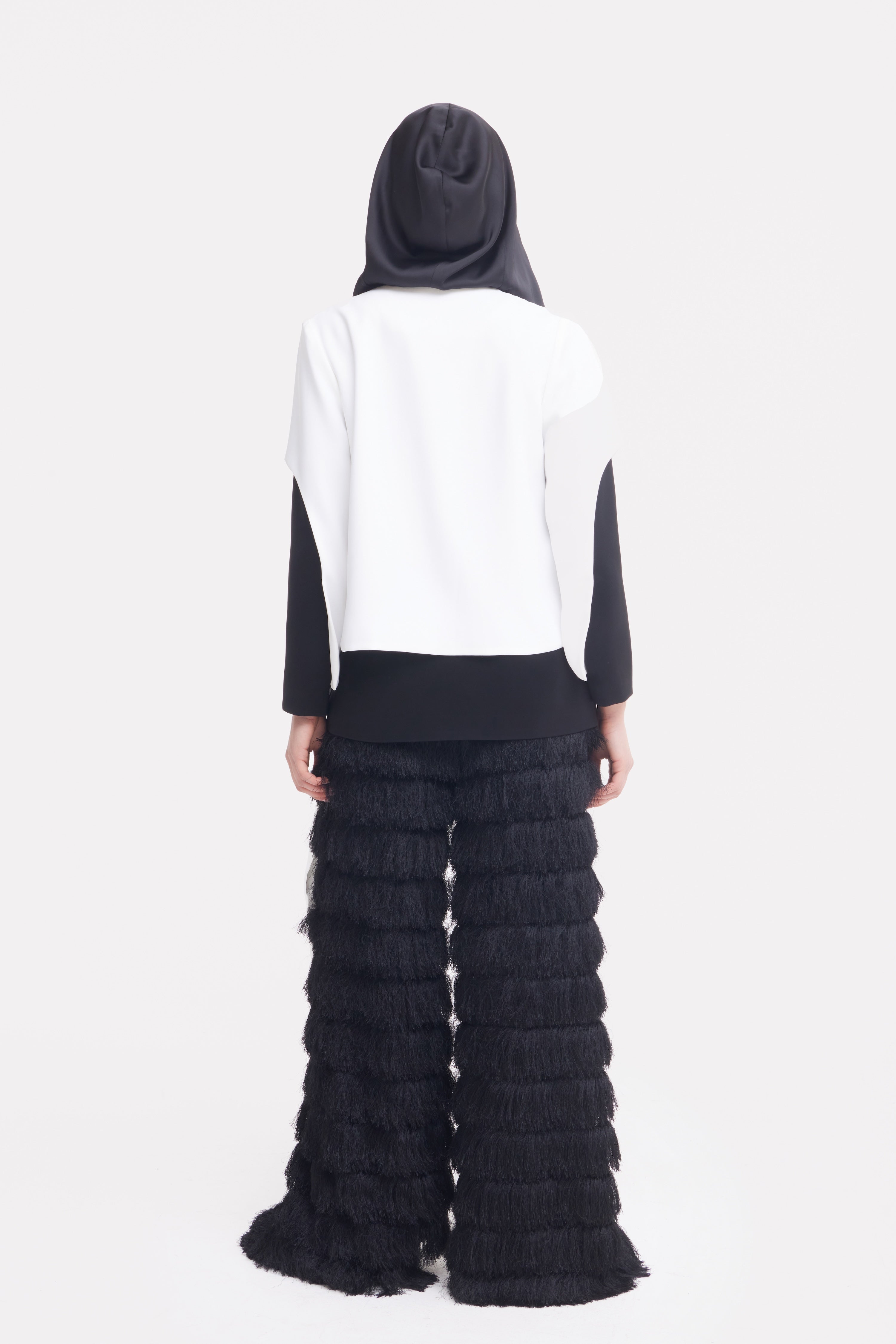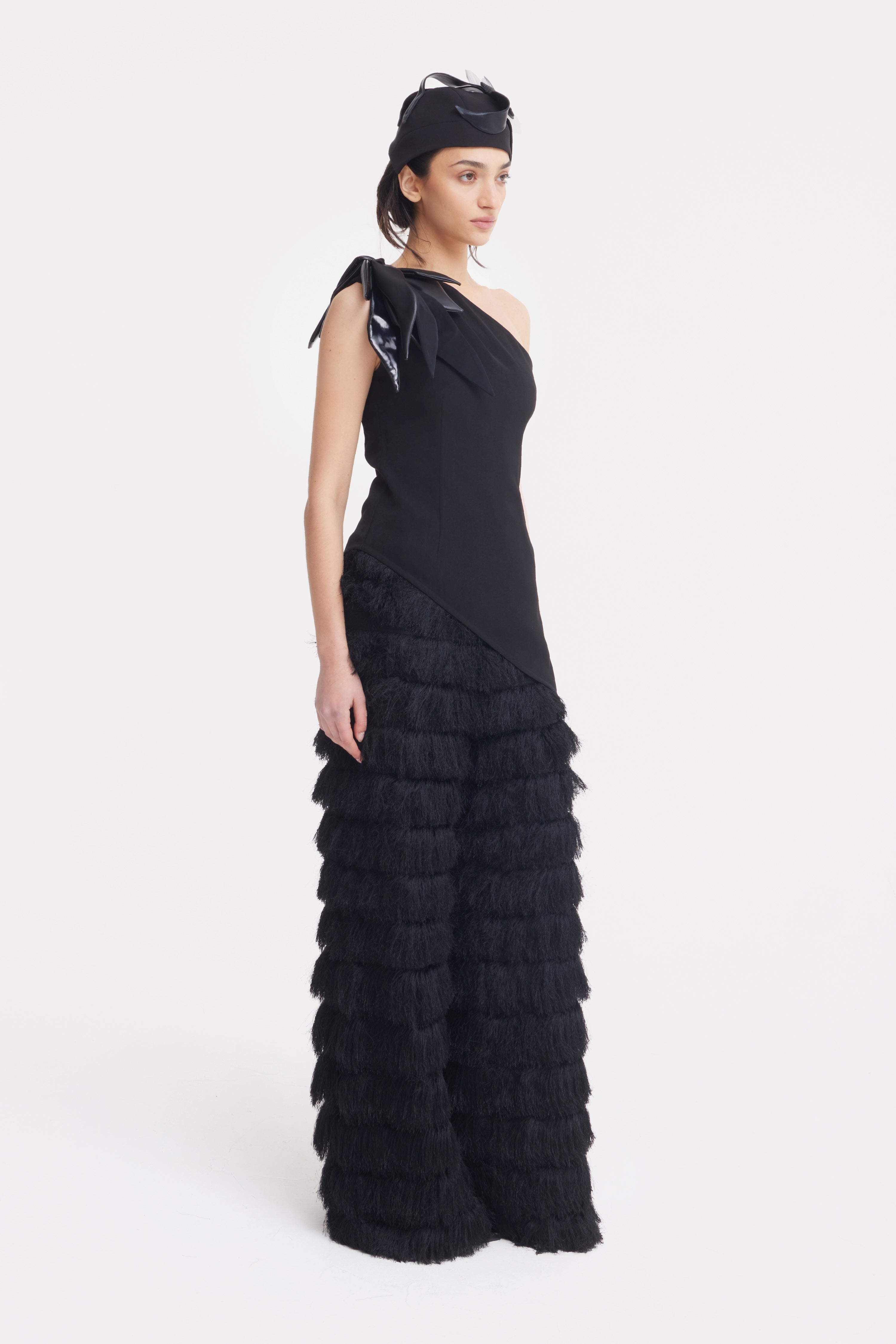 These black wide-leg trousers redefine evening elegance with a bold, textural twist. Crafted from layers of fine fringe with subtle shimmer, they move fluidly with every step, creating depth and dramatic presence. The high-rise elastic waistband ensures comfort without compromising on sophistication, while the wide-leg silhouette elongates the figure. Fully lined for ease of wear, these trousers are a statement piece designed to stand out in both formal and creative settings. Pair them with minimalist tops or tailored blazers for a look that blends artful design with modern versatility.