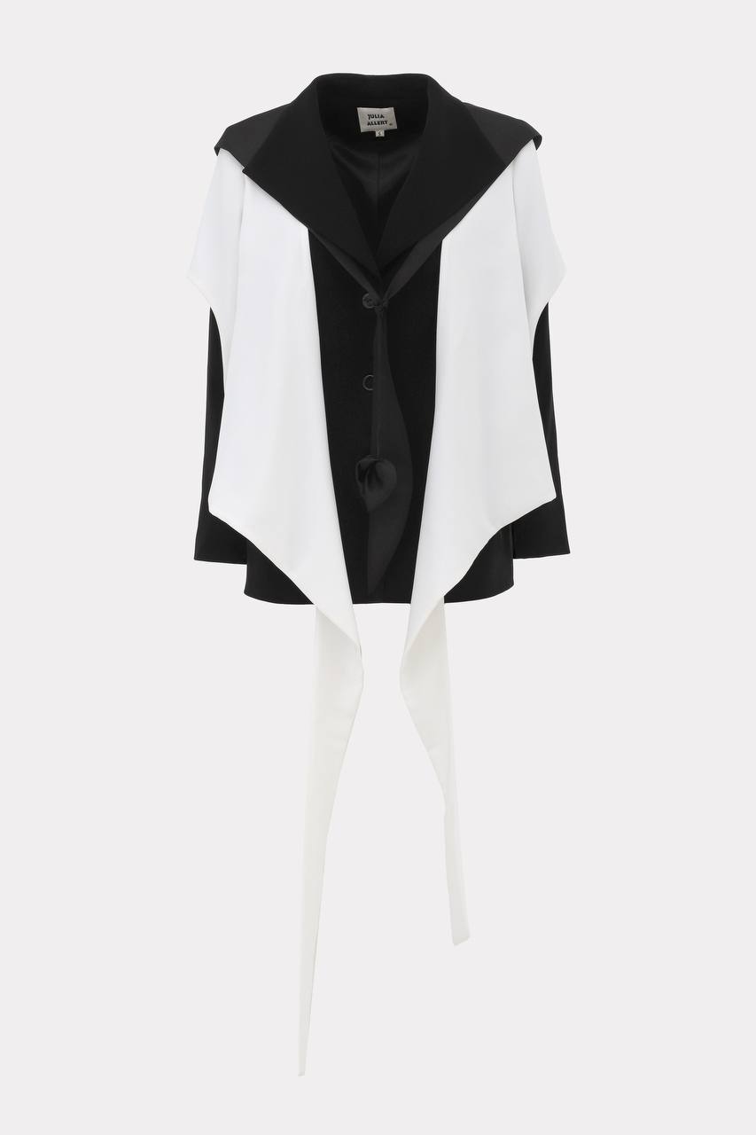 A statement of structure and duality. This black-and-white layered blazer redefines tailoring with its asymmetric draped panels and elongated lapels. The deconstructed silhouette blends sharp geometry with soft fluidity, creating a bold architectural look. Crafted from premium suiting fabric with a smooth inner finish, it offers both comfort and visual impact. Ethically made in Europe, this piece brings together artful design and refined craftsmanship — ideal for modern power dressing or evening sophistication.