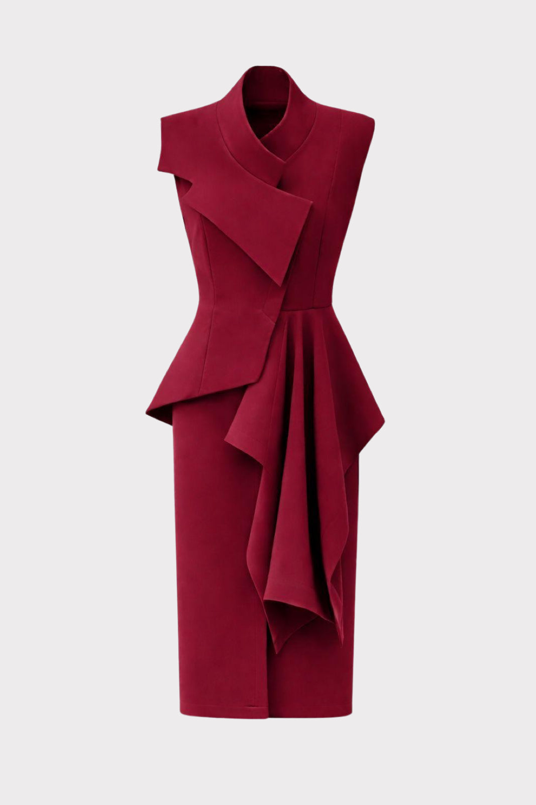 Architectural silhouette · Fitted waist · Asymmetrical draping · Structured neckline · Layered panels · Midi length · Defined shape · Structured drape · Burgundy color