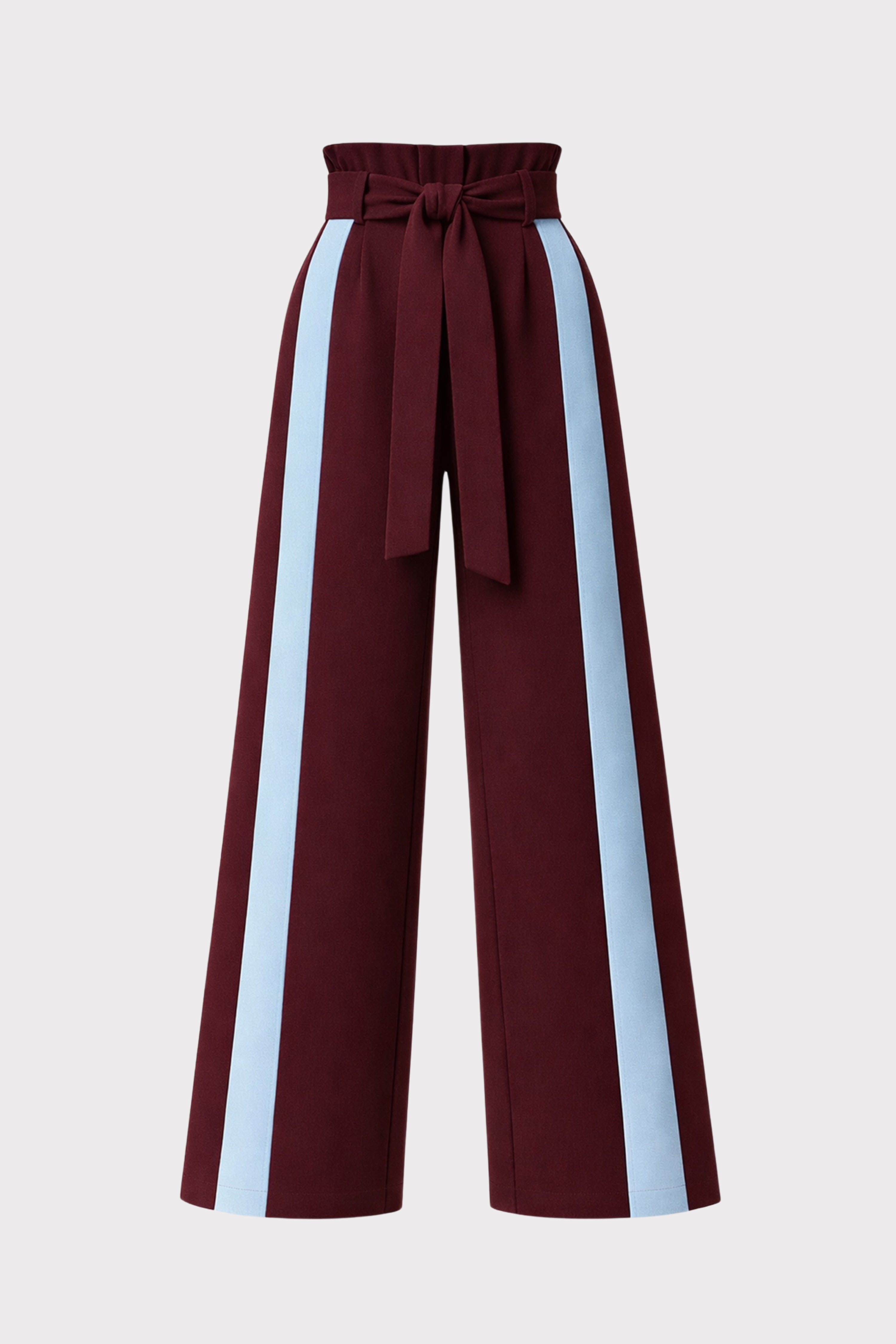 Designed with a strong yet elegant silhouette, these high-waist wide leg pants bring architectural precision to a timeless form. The sculpted waistband sits high on the waist, enhancing proportions, while the wide leg cut creates a fluid, elongated line. An integrated self-tie belt allows for a defined and adjustable fit, adding a refined detail to the waistline. Contrasting vertical stripes introduce a graphic accent and visually lengthen the legs. Crafted from smooth, structured fabric with a clean drape, these pants retain their shape and sophistication throughout the day. A statement piece for modern tailoring, suited for elevated business looks, evening ensembles, or confident everyday styling.