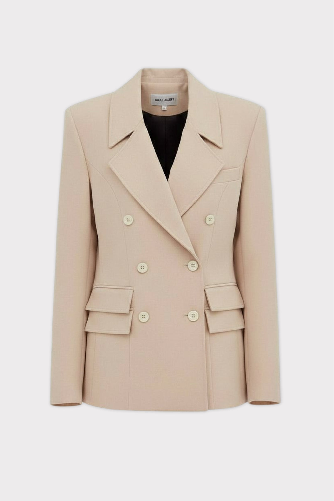 Double-breasted closure · Structured shoulders · Peak lapels · Layered flap pockets · Tailored fit · Fully lined · Beige