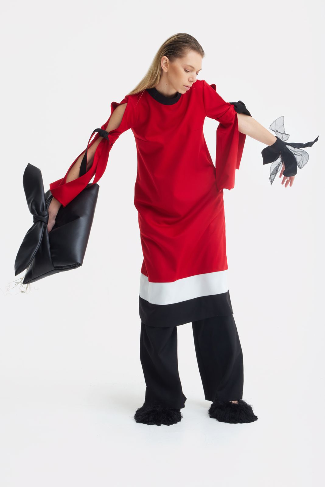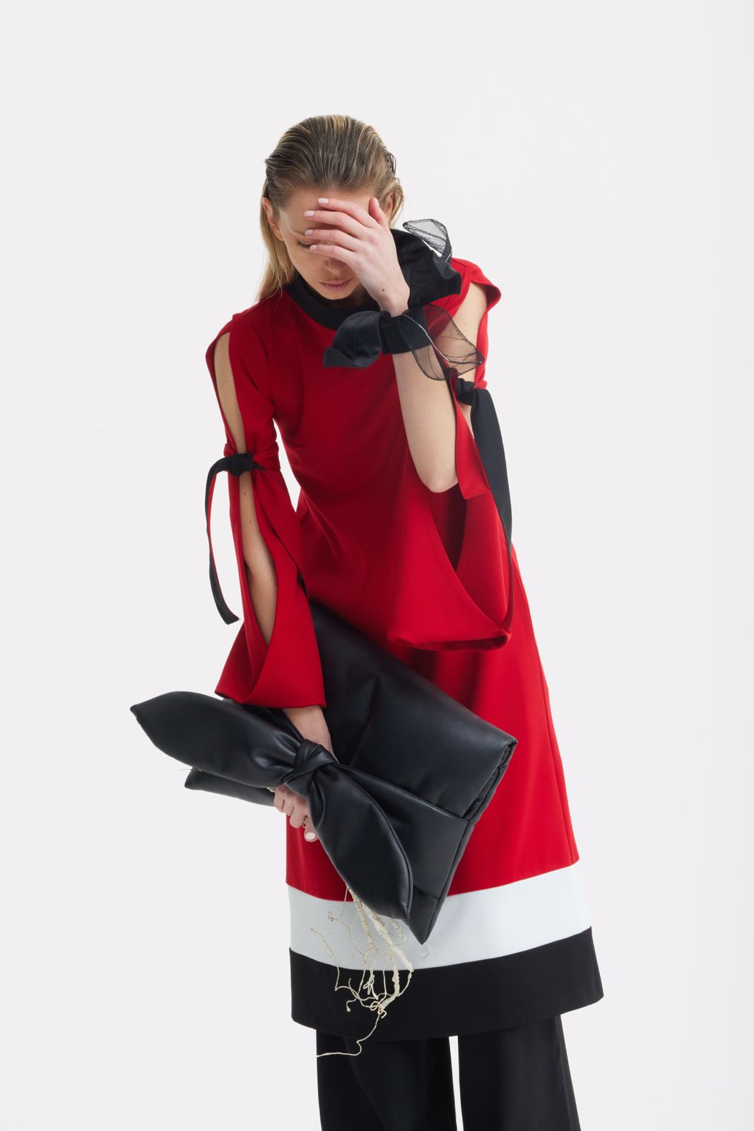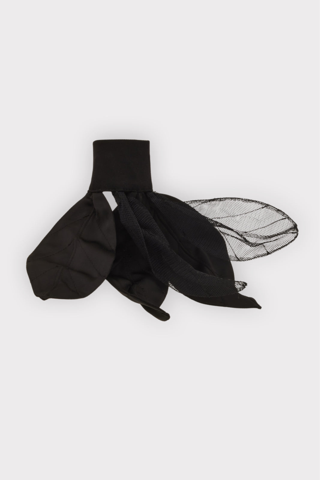 A sculptural accent designed to transform the gesture of the hand. This statement cuff is crafted from smooth black satin, structured to hold its architectural form while remaining light and wearable. Petal-inspired panels unfold around the wrist, complemented by airy tulle elements that introduce movement and subtle transparency.