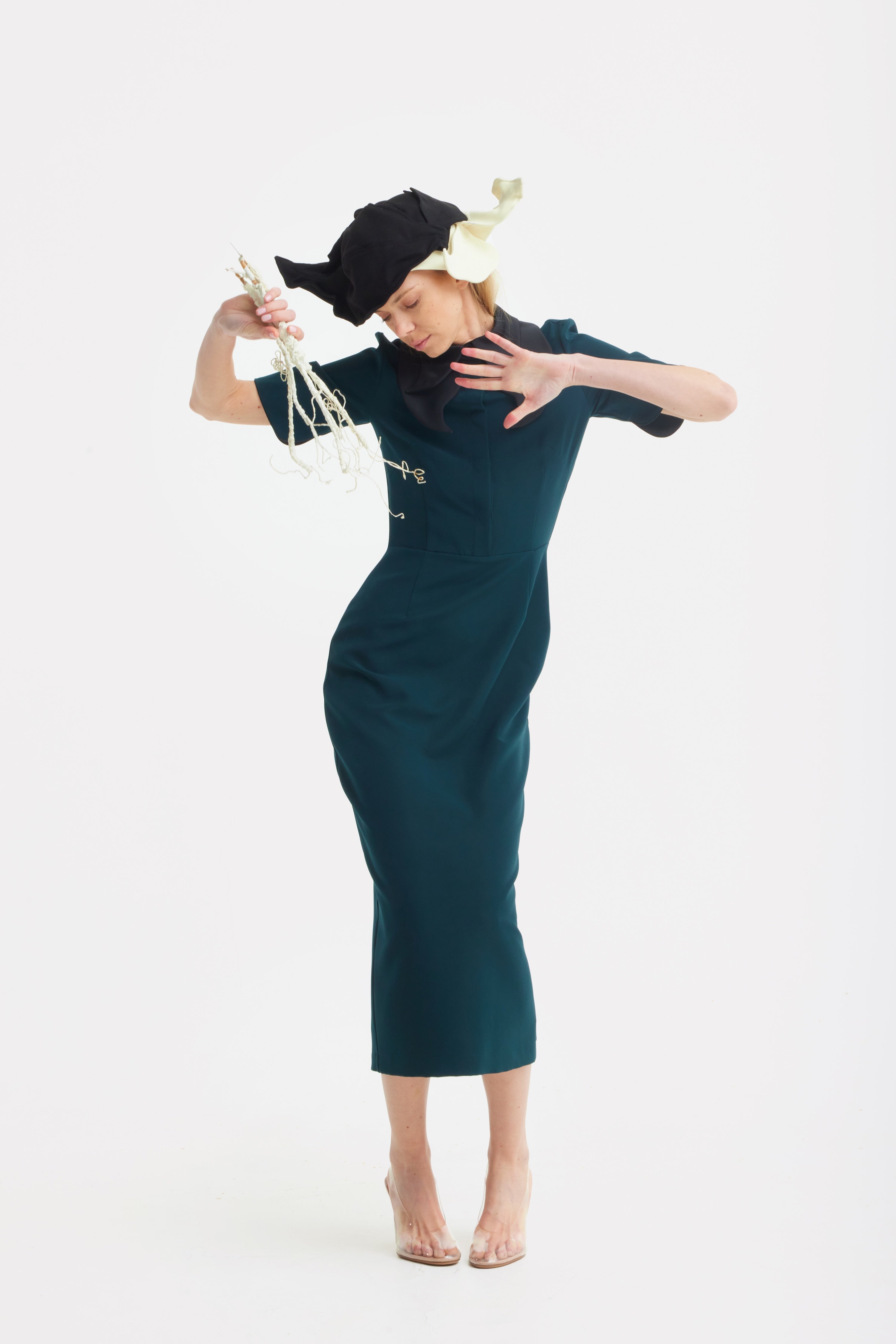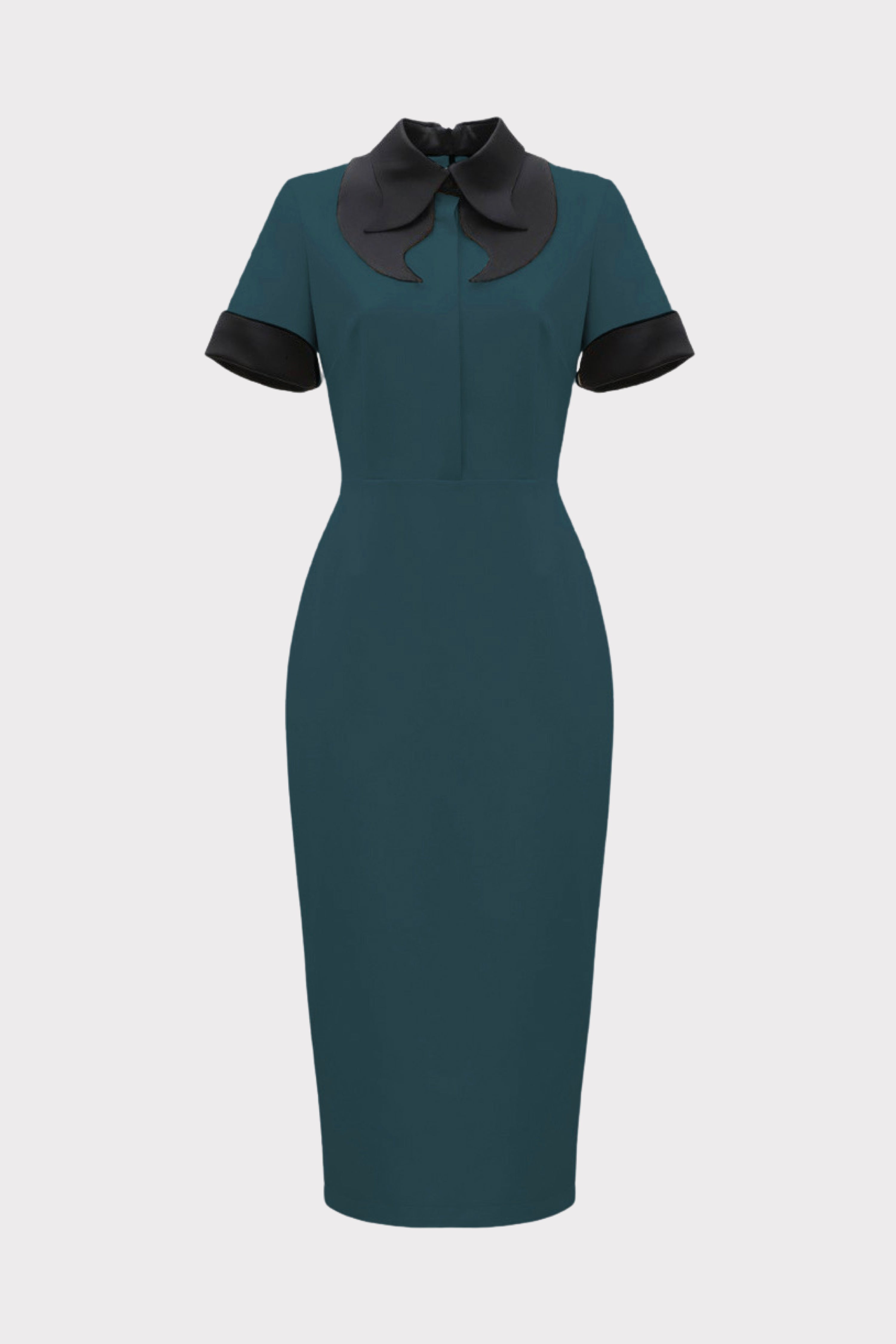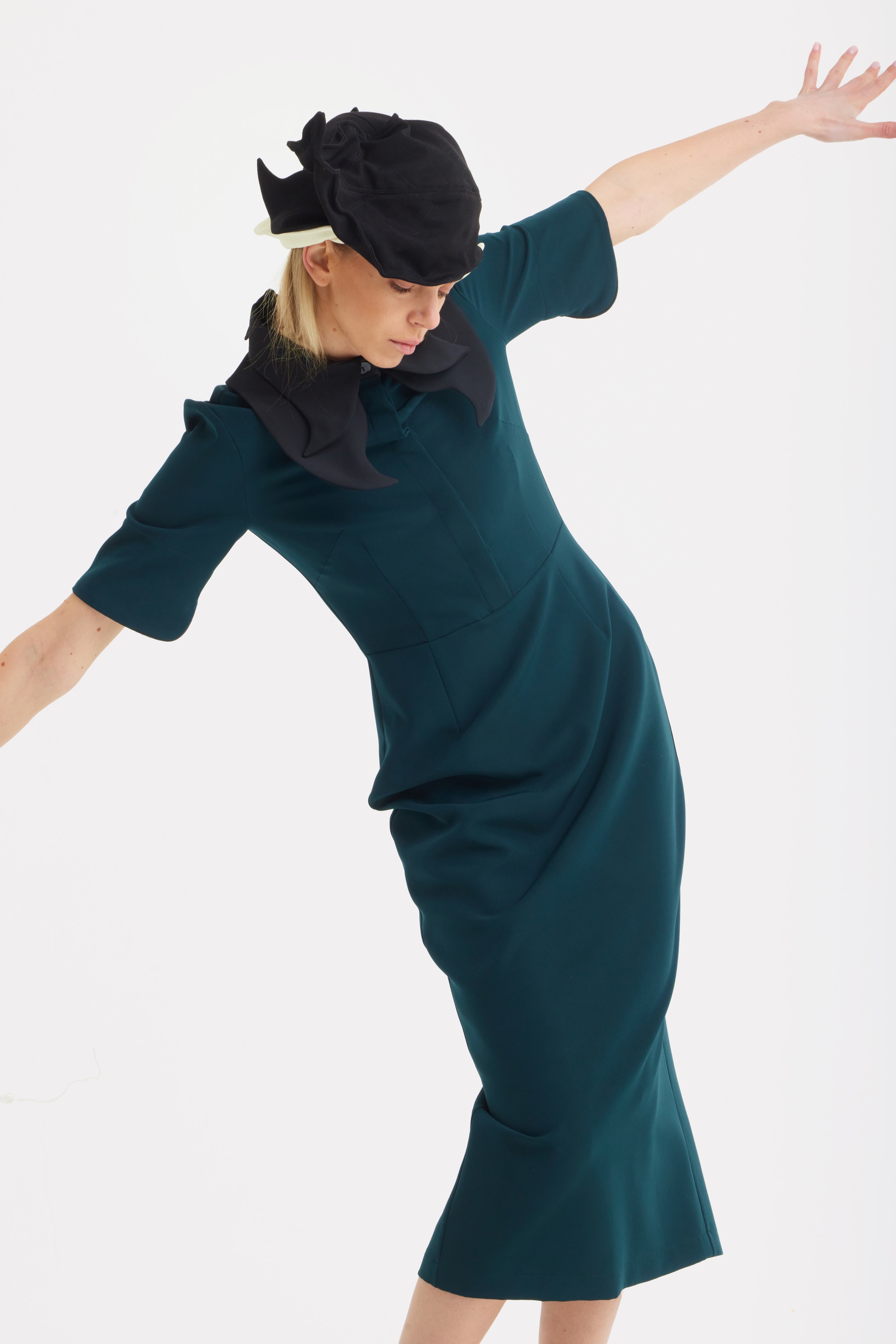 Tailored elegance with a modern twist. This green midi dress is cut from a medium-weight viscose-blend suiting fabric with slight stretch, offering structure and comfort in equal measure. The fitted silhouette defines the waist, while the sculptural collar and contrasting cuffs introduce graphic precision. A hidden back zipper ensures a clean finish. Ethically made in Europe, this versatile dress reimagines the classic dress code — perfect for office wear, evening edits, or smart occasions.