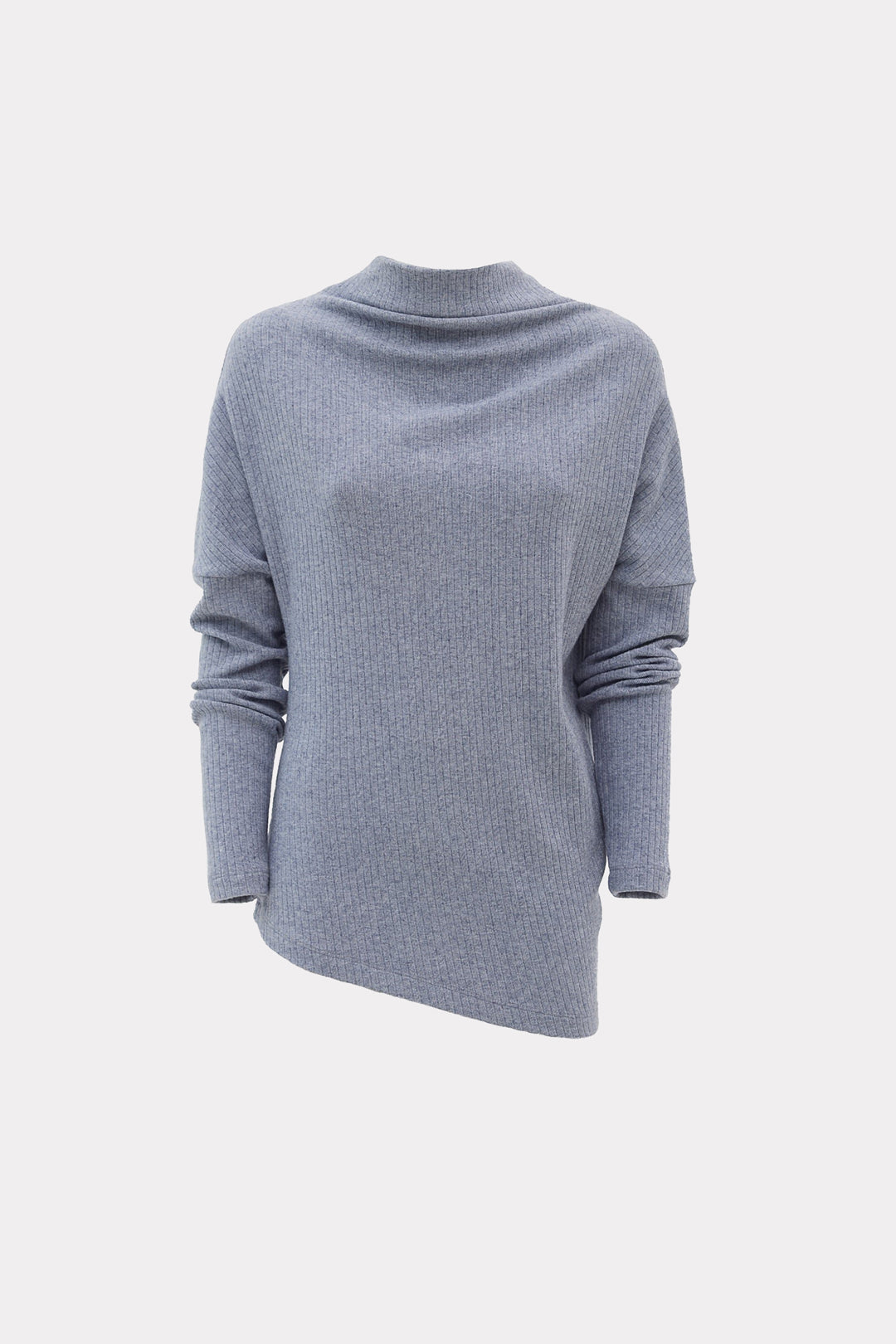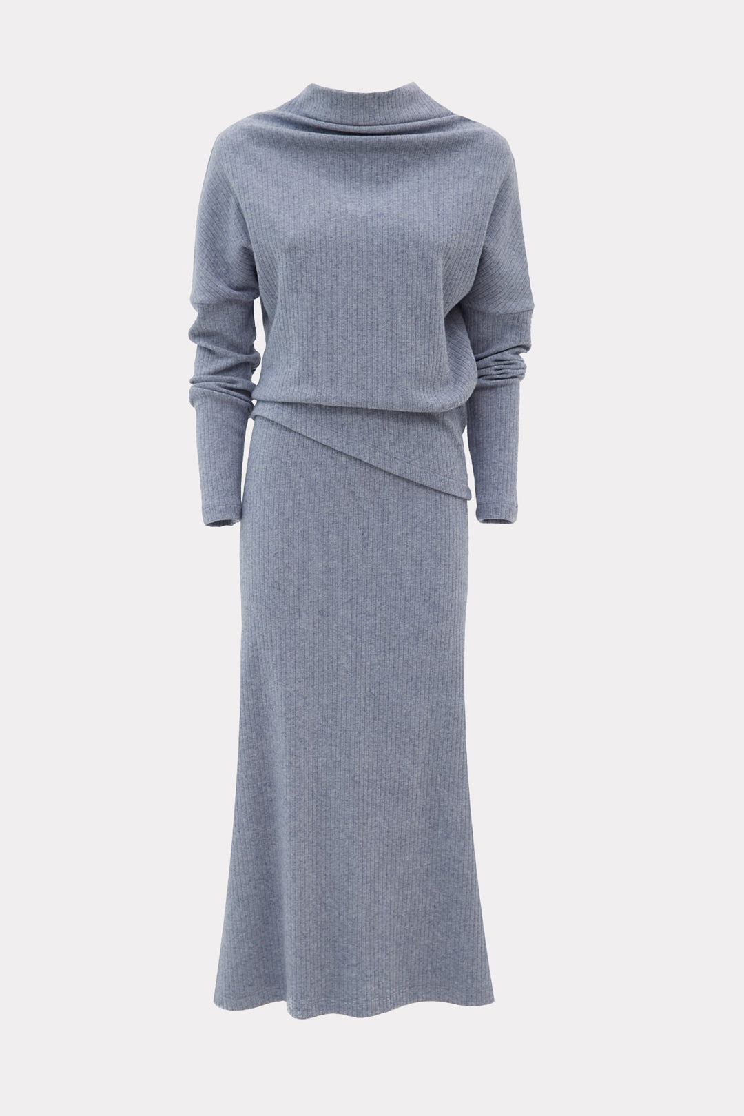 This grey and blue rib knit suit, with its distinctive asymmetric blouse and classic midi skirt, is more than just an ensemble – it's a statement of sophisticated style. Whether worn together or mixed and matched with other items, it's sure to elevate your look with its understated elegance and versatility.
