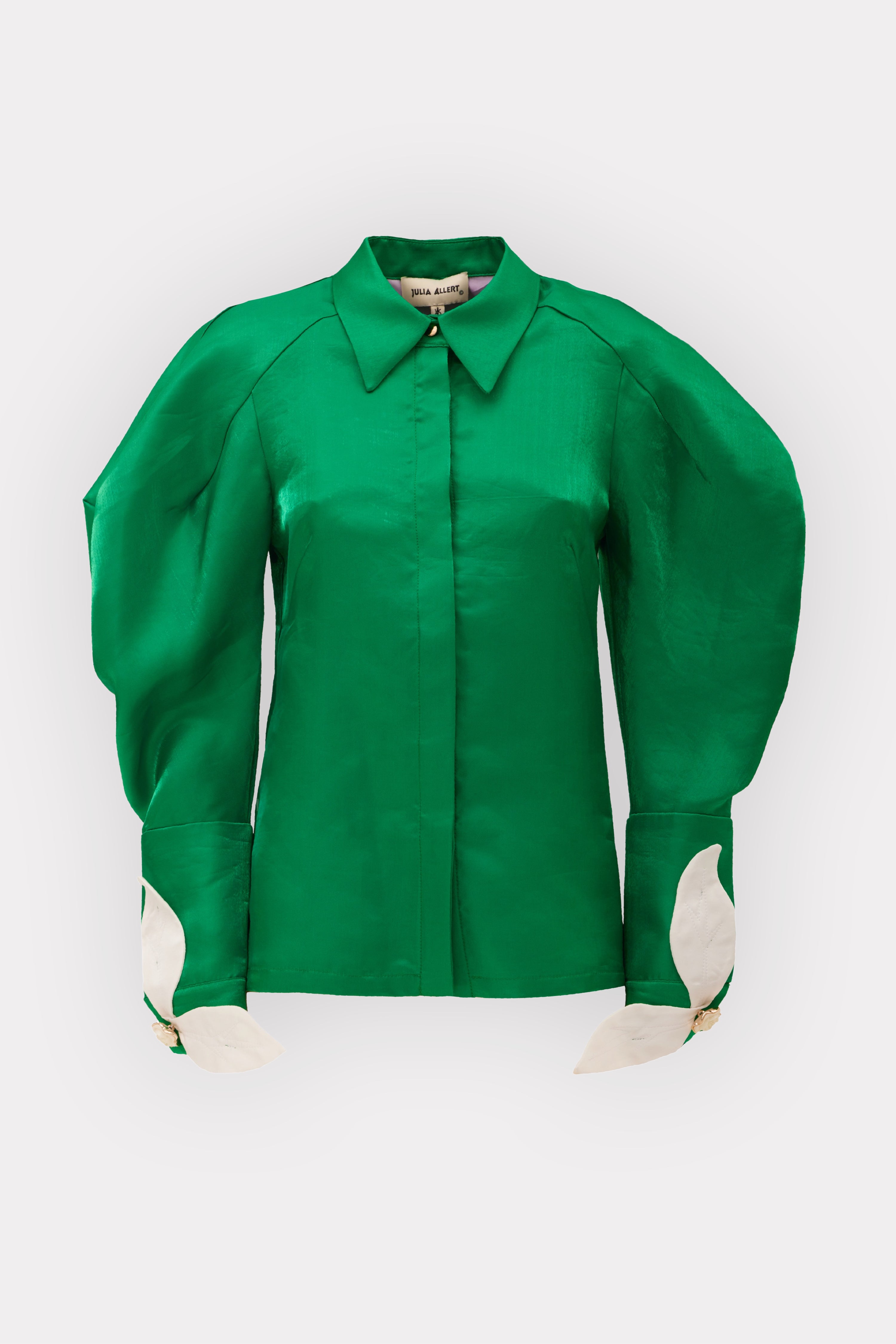 An expressive silhouette crafted in luminous silk organza. This bright green blouse captures the essence of modern romance through its sculptural balloon sleeves and refined tailoring. The crisp texture of the organza adds volume and lightness, while the structured cuffs and concealed front closure balance the look with precision. A statement piece designed to elevate any outfit, from tailored trousers to flowing skirts, embodying Julia Allert’s vision of confident femininity and timeless artistry.