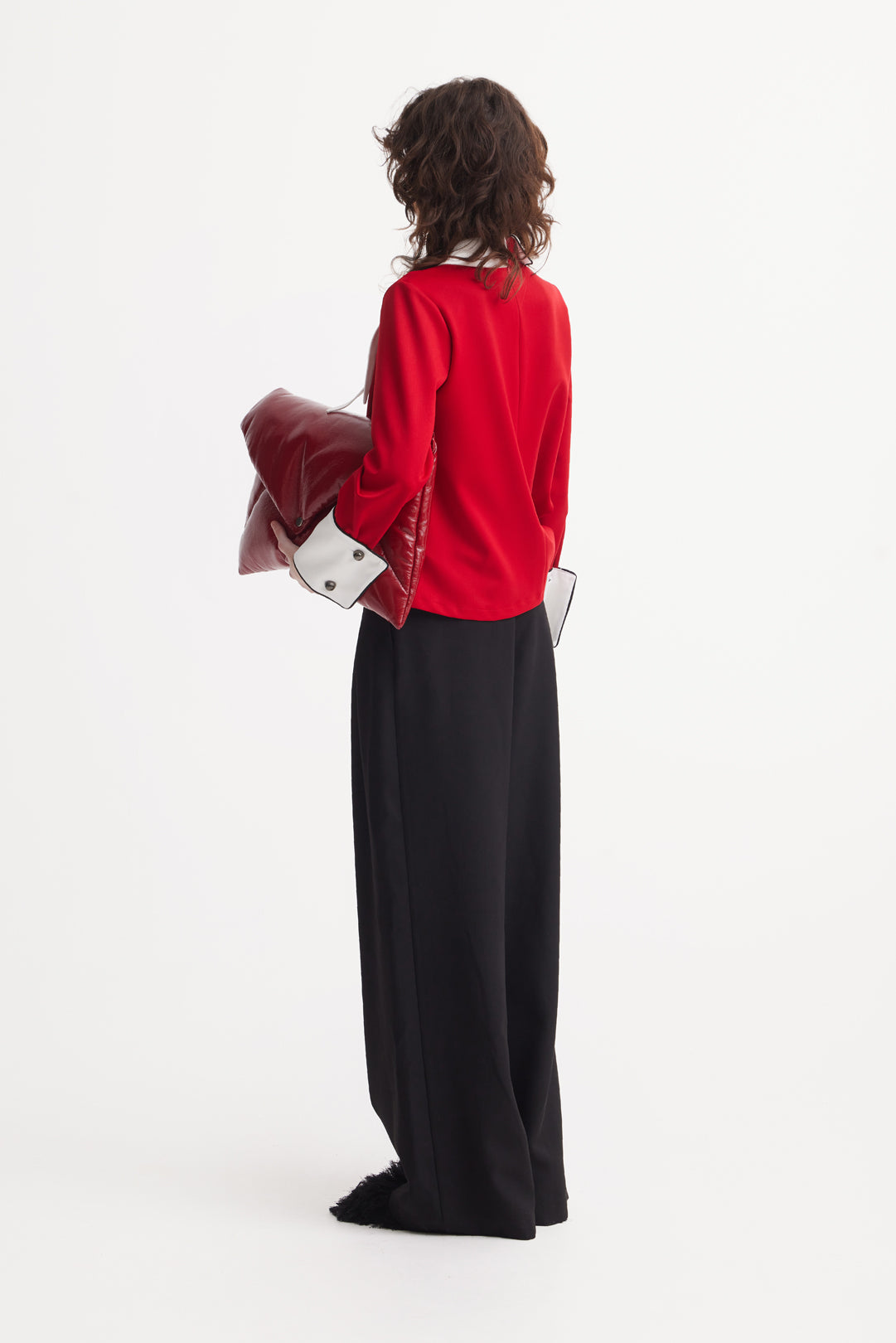 A refined blouse that balances structure with character. Crafted from suiting viscose for a smooth, polished feel, this red blouse features a sharp asymmetrical white collar and matching contrast cuffs adorned with sleek black buttons. The straight-cut silhouette flatters the body while maintaining ease and movement, making it perfect for professional and semi-formal looks alike.