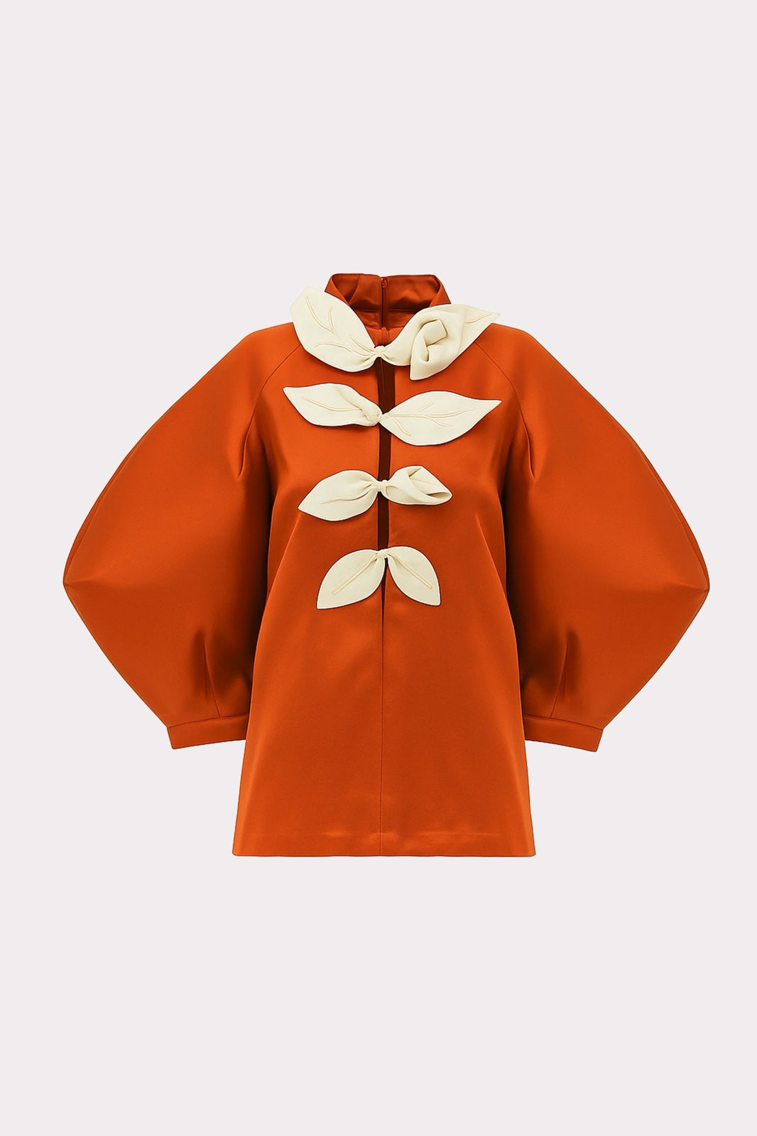 A modern sculpture in motion, this burnt orange taffeta blouse by Julia Allert captures the art of structured femininity. Crafted from premium satin-finish taffeta, it features a deep V-neckline and voluminous raglan sleeves that shape a bold, architectural silhouette.