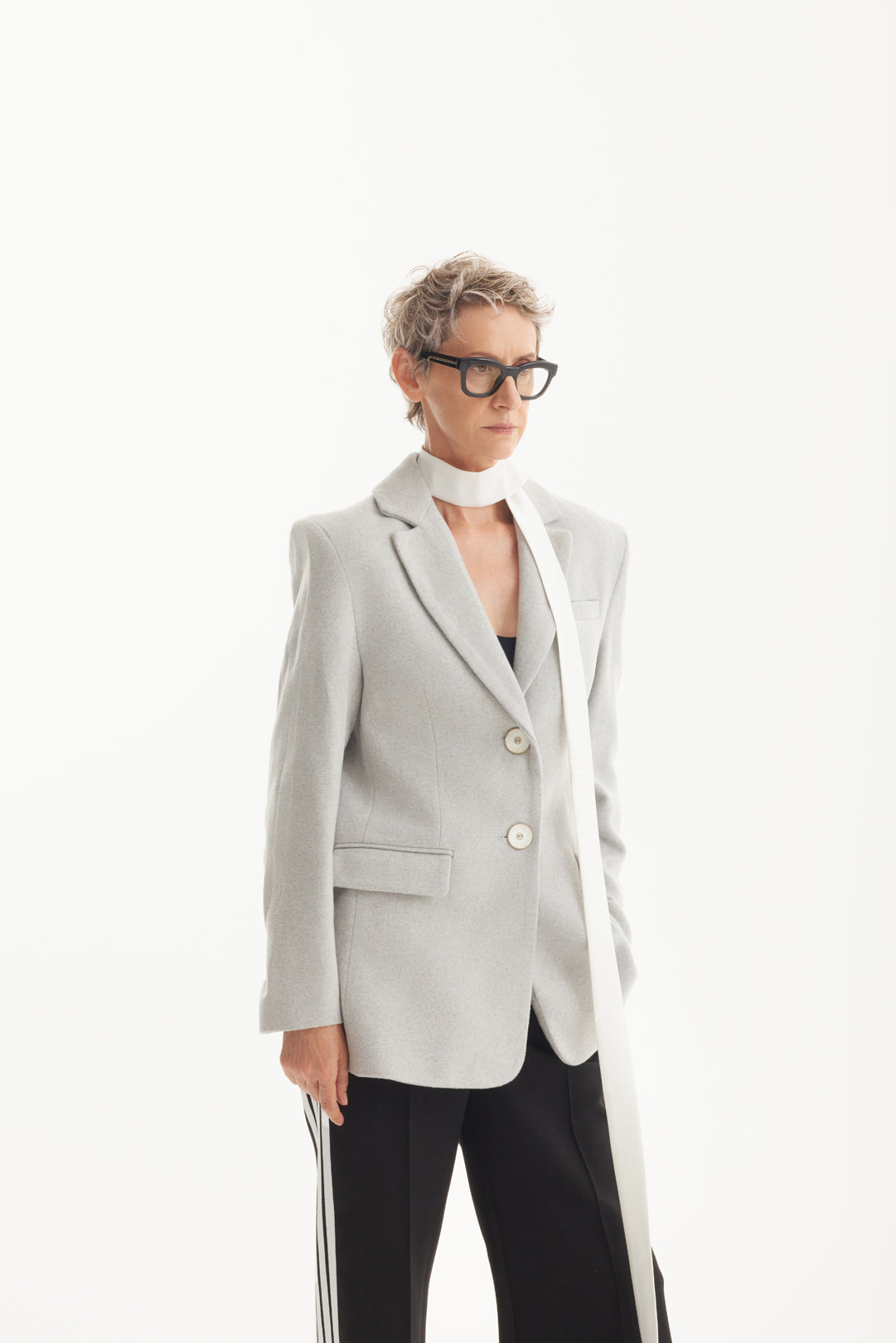 A refined wardrobe staple, this grey longline blazer is crafted from premium coat fabric with a smooth lining for structure and comfort. Its tailored silhouette is defined by a classic notched lapel, two-button closure, and functional flap pockets, delivering polish with ease. Versatile and seasonless, it layers effortlessly over tailored trousers or dresses, transitioning from professional settings to evening moments. Ethically made in Europe, this blazer embodies timeless sophistication with everyday practicality.