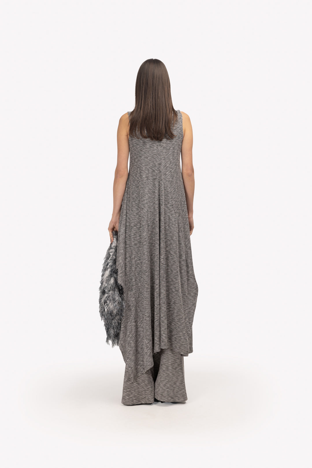 Subtle texture, strong identity. The Textured Grey knit set offers a soft architectural take on layering: a draped asymmetrical dress paired with wide-leg pants in ribbed knit. Its tonal structure enhances depth and dimension, creating a look that’s effortlessly modern and quietly confident. Designed for versatility, it transitions from casual sophistication to artistic eveningwear with ease.